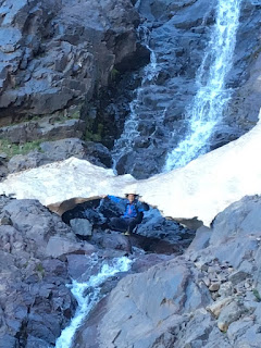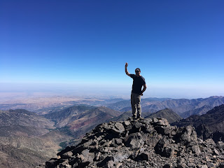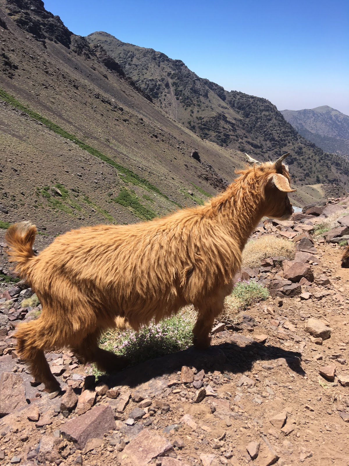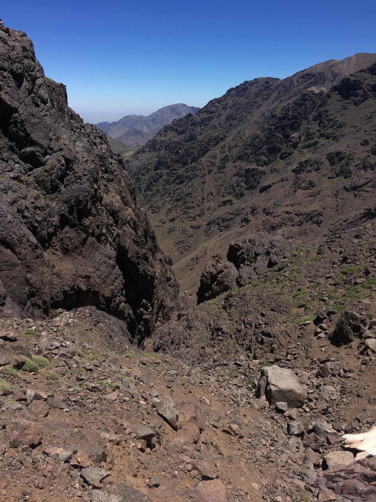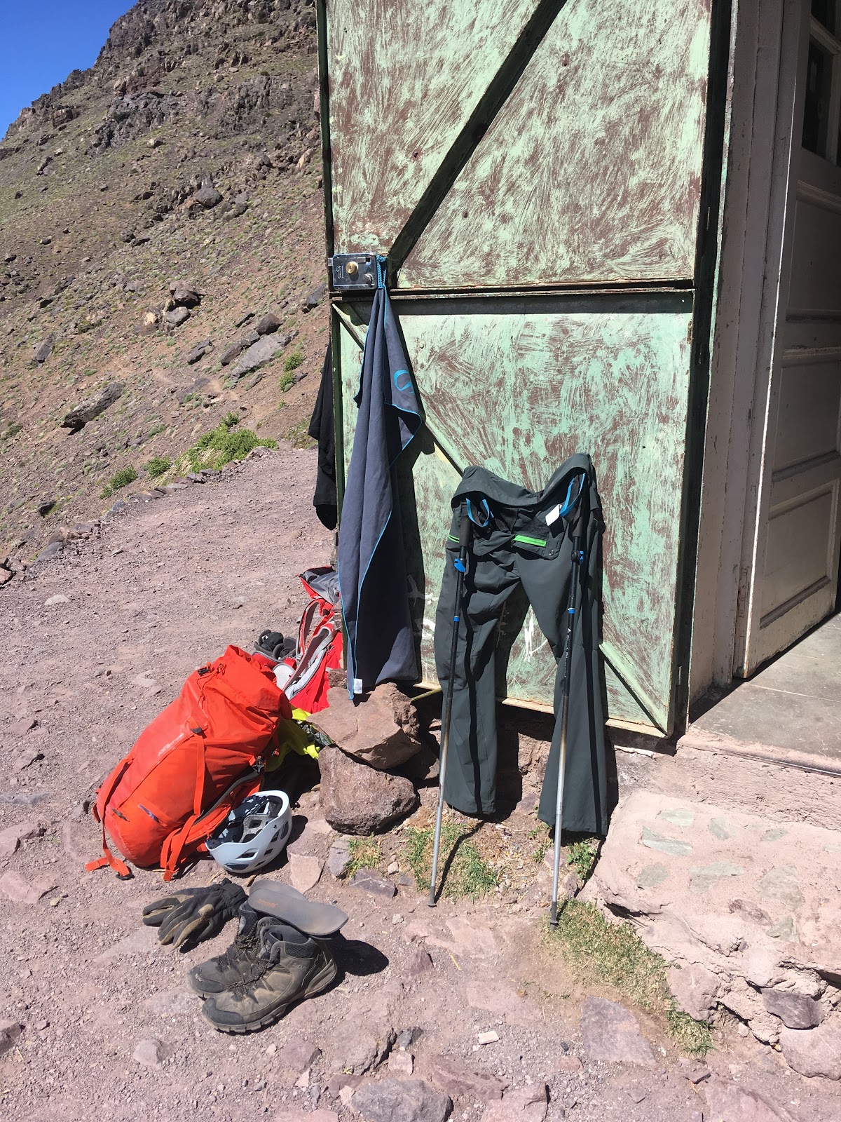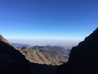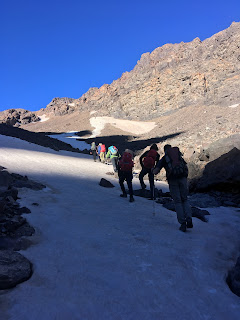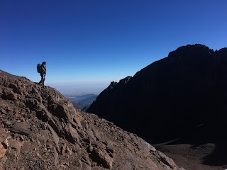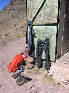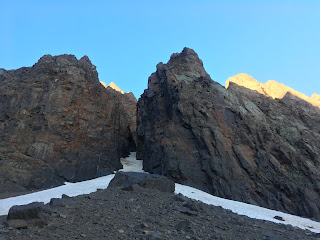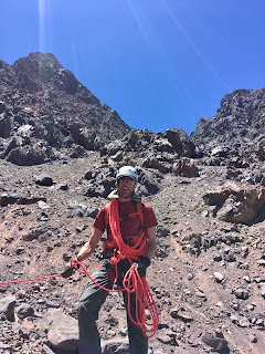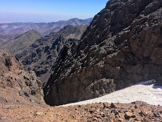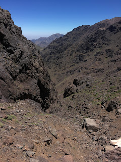 Higher up, we crossed a waterfall and continued up grade I/II scrambling terrain, with helmets, but no ropes. The gradient eased off on the final hike upto the Col (Tizi Melloul), at 3850m. We have all acclimatised well, but we all felt a little slow at this point.