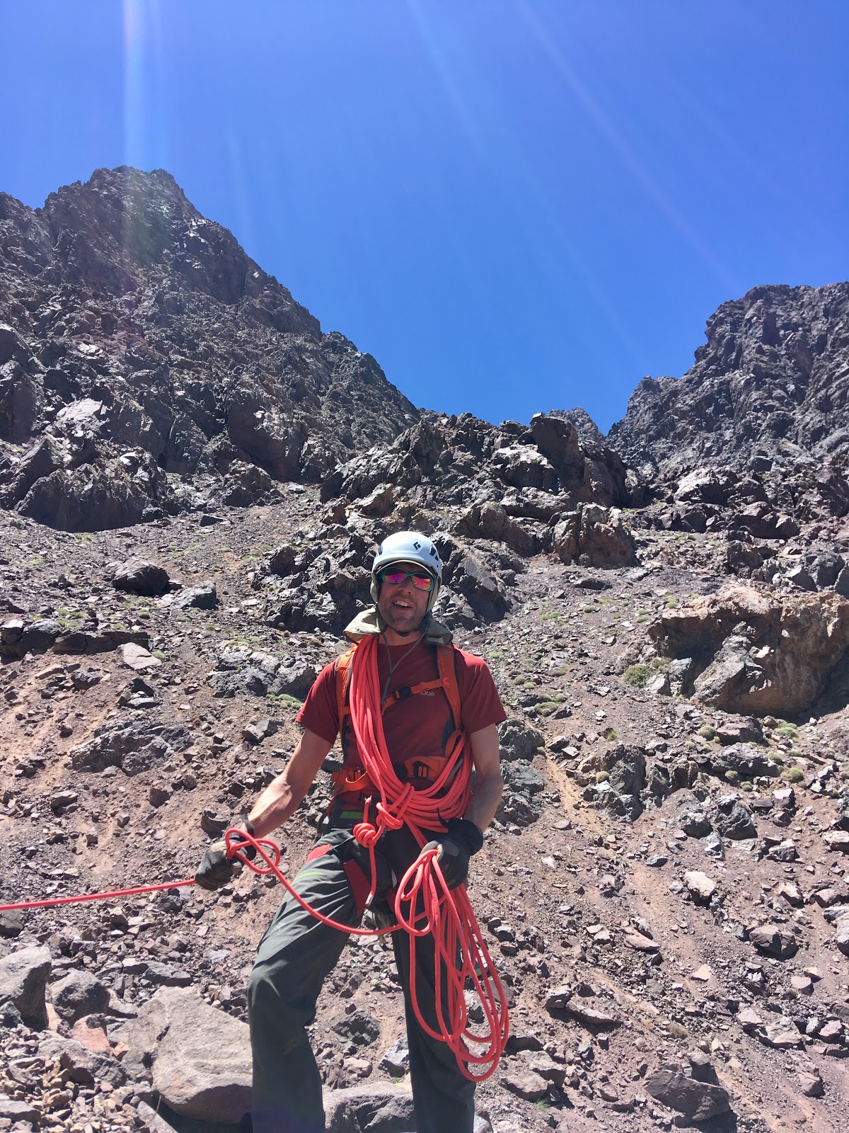Looking over the edge, John and I agreed that it was indeed ‘steep’. Very steep. It was also filled with very loose rocks of all shapes and sizes and no obvious sign of a path down. Hamed, assured us it was the correct place and set off like a mountain goat, singing at the top of his voice. We stopped and pulled out all our mountaineering kit, helmets and gloves and braced ourselves for what was likely to be a memorable few hours of hard graft!