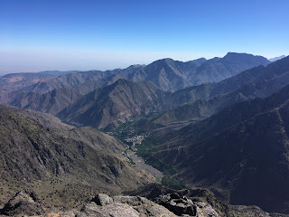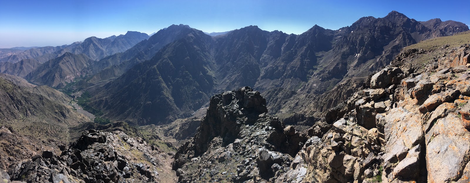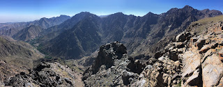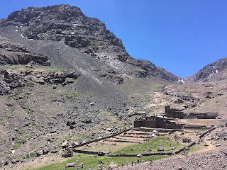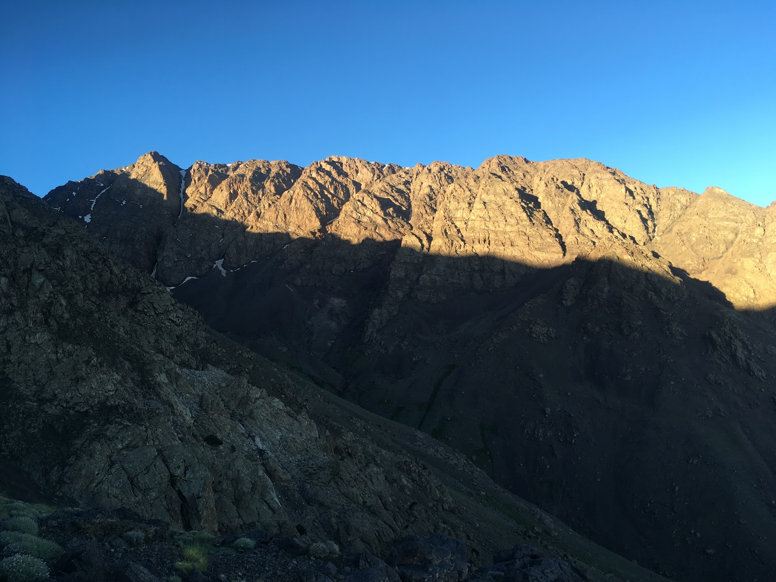 We beat the heat again today, with another 5am start. To reach to col that would take us over to the Toubkal Refuge, we had to ascend some 600m via some 84 zig-zags. Thankfully, it was all in the shade and we barely sweated on the way up. From the col, we made a short scramble to the northern peak, which gave some great views of the next valley. Far away, we could see Imlil and Around, where our expedition had started from and where, all being well, we’ll be resting tomorrow night. In the other direction, was the bulk of Jebel Toubkal – the highest point in North Africa and our objective for tomorrow. On the way down to the Toubkal Refuge, we had a ridiculously big lunch, served on a rocky out crop above the valley. The concept of a packed lunch has not arrived in Morocco, but then again, why have a squashed cheese sandwich, when you could have hot pasta, fish, salad, veggies, beans and bread. Washed down with Mint Tea and a slice of melon to finish. And of course a quick sun bath to aid digestion. This mountaineering lark can be really tough at times! Ha!
