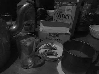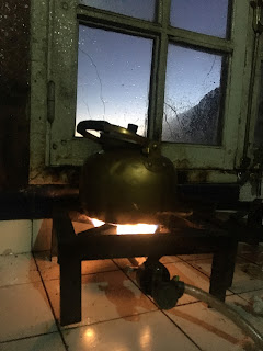 Two slices of dry bread, lathered in Laughing Cow cheese and jam, half a bowl of watery porridge (2:1 parts porridge to jam) and a mug of instant coffee with powdered milk. Not exactly the breakfast of champions, but my current regular start to the day.