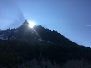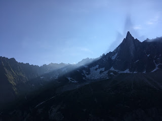 Wanting to do this trek, but without it being too busy, we caught the second train of the morning up to the Montenvers Railway station above the Mer de Glace. As it turns out, we were a bit too early as, having walked down the the edge of the glacier at 09:15, we found that the ice cave is not open to the public until 09:50. However, this meant that we had plenty of time to appreciate the sun rising behind the Dru, which was a real spectacle. Beams of sunlight were casting shadows on the morning misty sky.