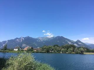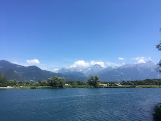 It’s really turning out to be quite a sociable summer trip. A took the drive up and over the Forclaz Col and down the switchbacks to visit a friend in Switzerland today. We used to work together, when we lived here around 2004. Caroline now lives down in the Rhone Valley, so I didn’t go up to Villars, but we still got the skyline view from her house. And, just a few minutes bike ride away was a delightful lake where we went swimming to cool off in the afternoon heat.