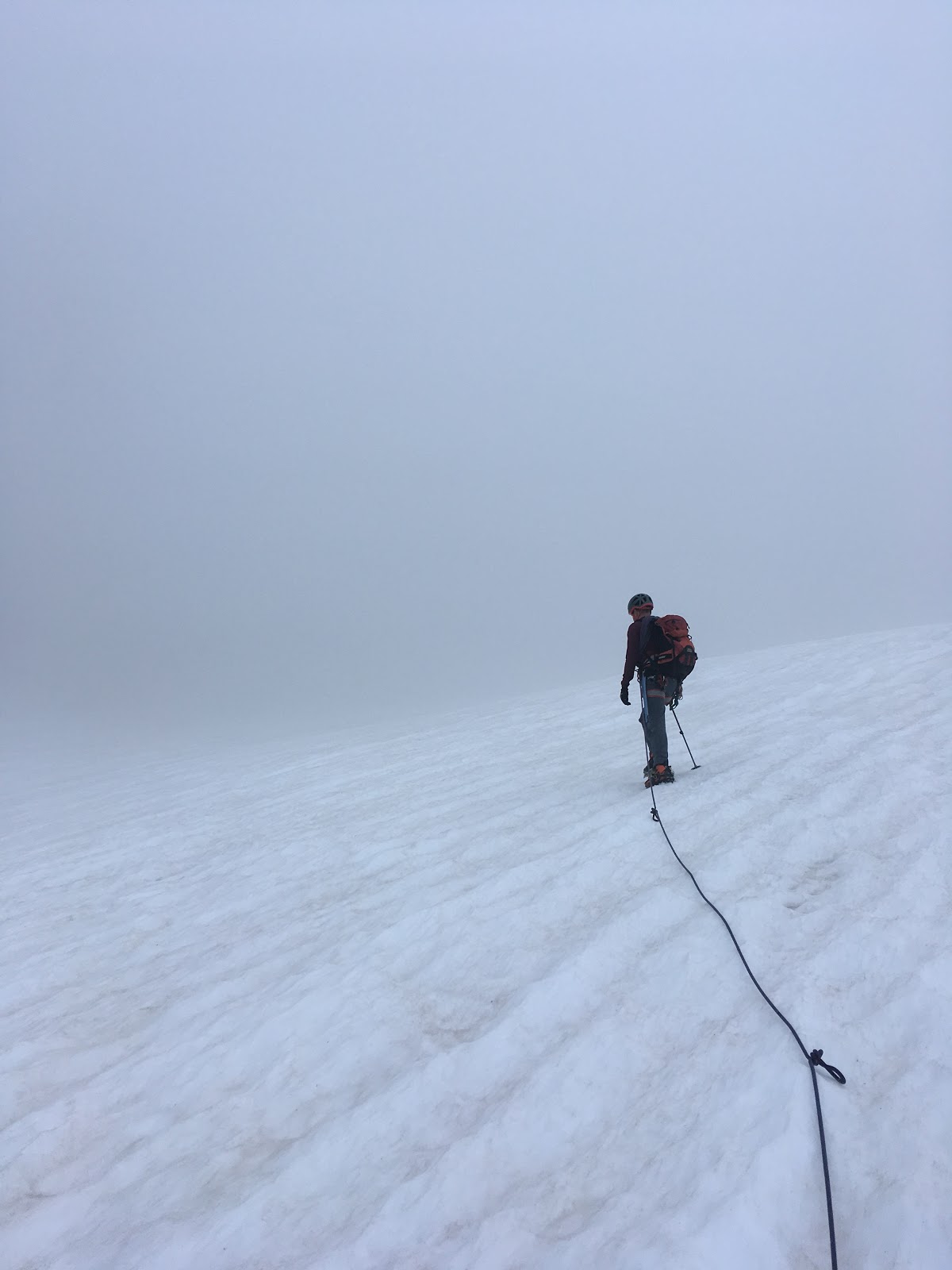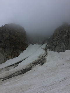 We followed the Tour Glacier upwards and into the mist, unsure whether to change our plans to an easier objective.