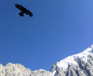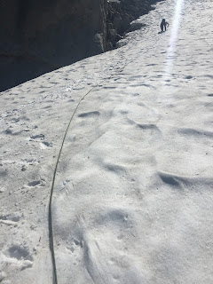 We had not accounted for the snow patch at the base either, so I set off using a rock as an ice axe and carefully climbed the frozen steps of a previous team.
