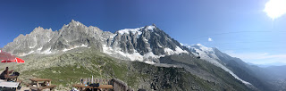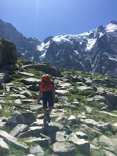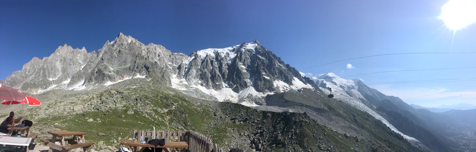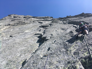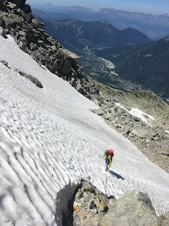 Felt a bit of a Chamonix amateur this morning, as our best laid plans had not accounted for several thousand tourists getting in our way! After a leisurely start, we pack bags and walked over to the Midi lift hoping to get whisked up to the high mountains. Unfortunately, there was an enormous queue packed into the square. Having eventually stood in line under the blazing sun and procured a ticket, we were then told that the next available lift would not be until midday! Nick went off swimming and we re-grouped in time for our scheduled ride. Once at teh half way station, we soon left the hoards behind and hiked our way up to the slabs, which were just coming into the sun.