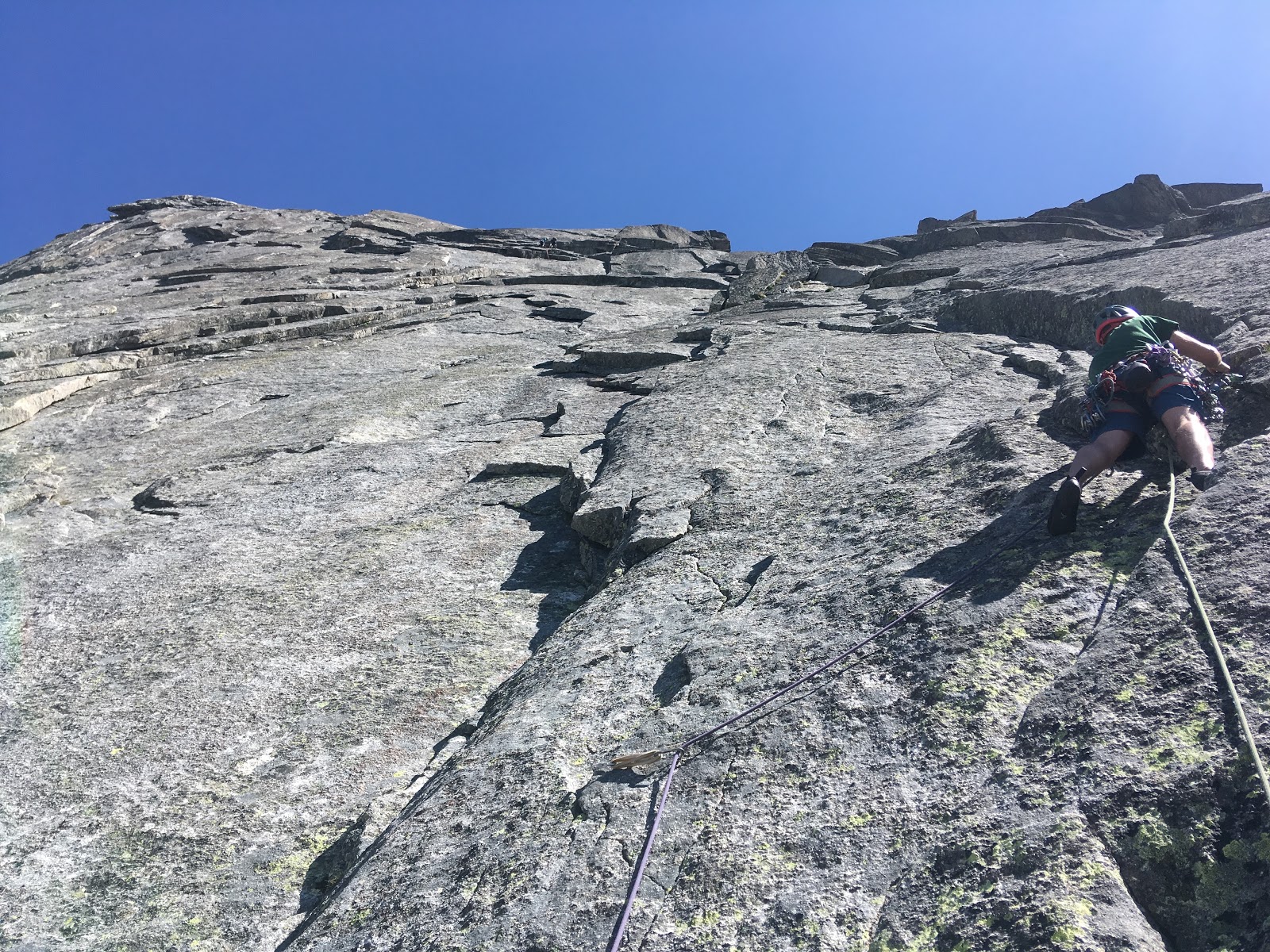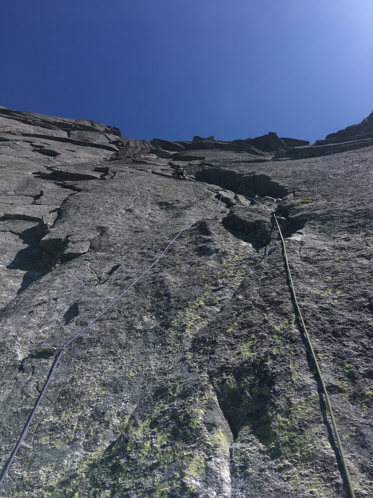 The tricky thing was, actually finding the route. The sheer scale of the rock face meant that following a rough description to the base of the actual climbing was very hard. Every little, corner, buttress and spike, could have fitted the description. After essentially doing a pretty long scrambling route, things began to make sense, but we couldn’t locate the start exactly. The topo we had seemed to have us in the right place, so we set off upwards.