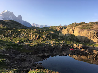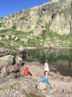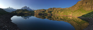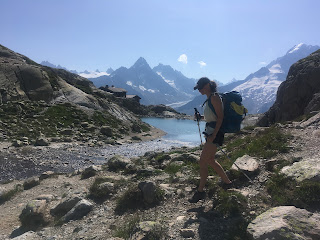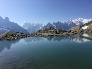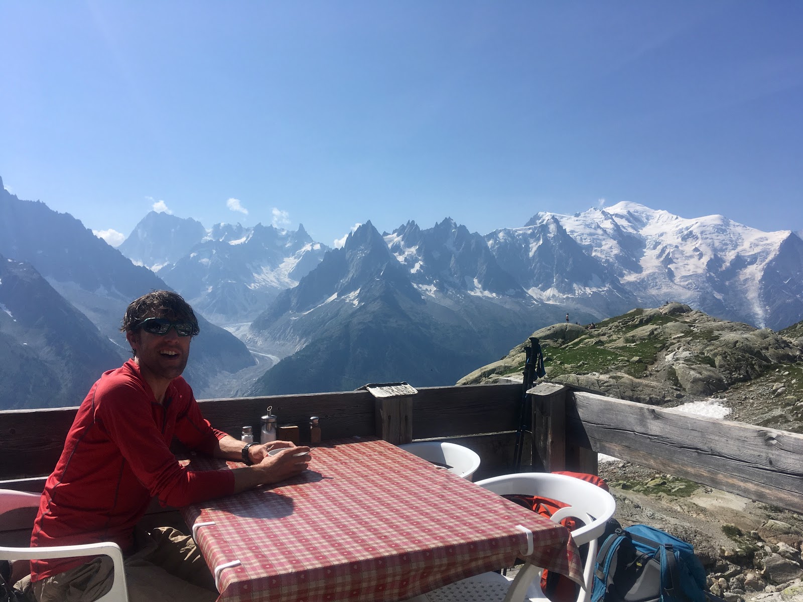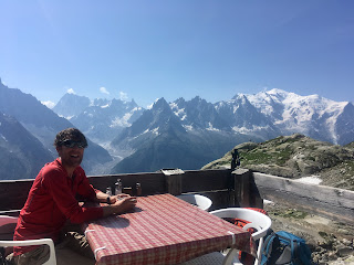 At the Chalet Refuge Lac Blanc, the TMB trekkers had now all left, but the day trippers had still not arrived, so we enjoyed the terrace all to ourselves while admiring the views.