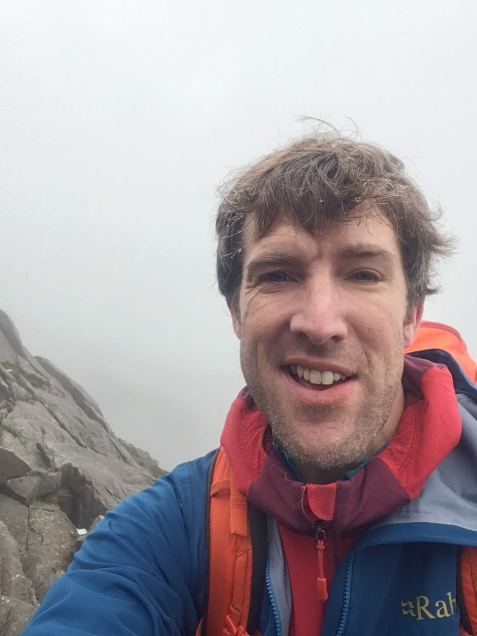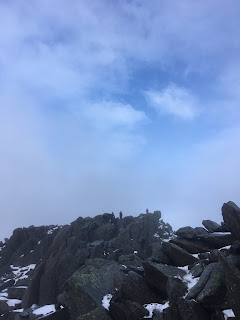 Having started quite fast, the final hundred meters took a really long time, partly due to negotiating slippery rocks while at the same time dodging incoming snowballs. Finally, the summit came into view and it looked for a moment that we might end up above the clouds. I managed to get a quick photo before the view closed in and it gently started to drizzle with cold, wet sleet.