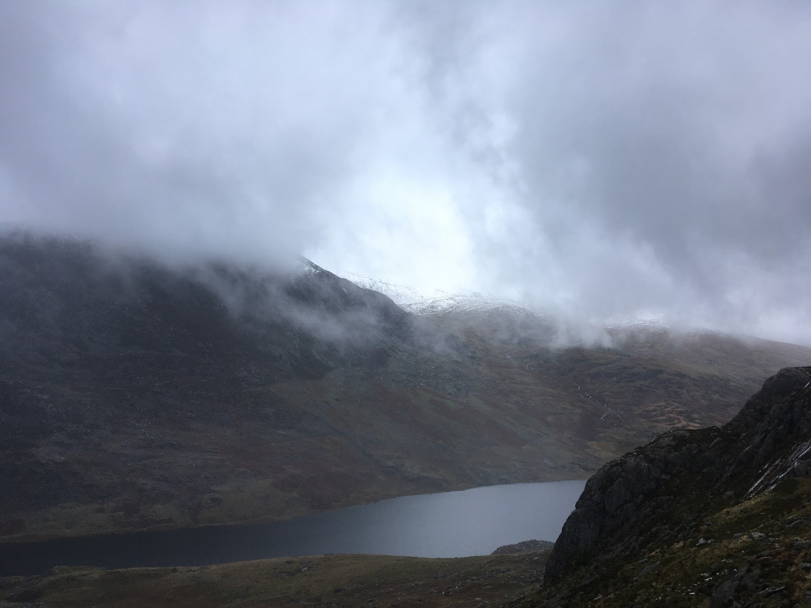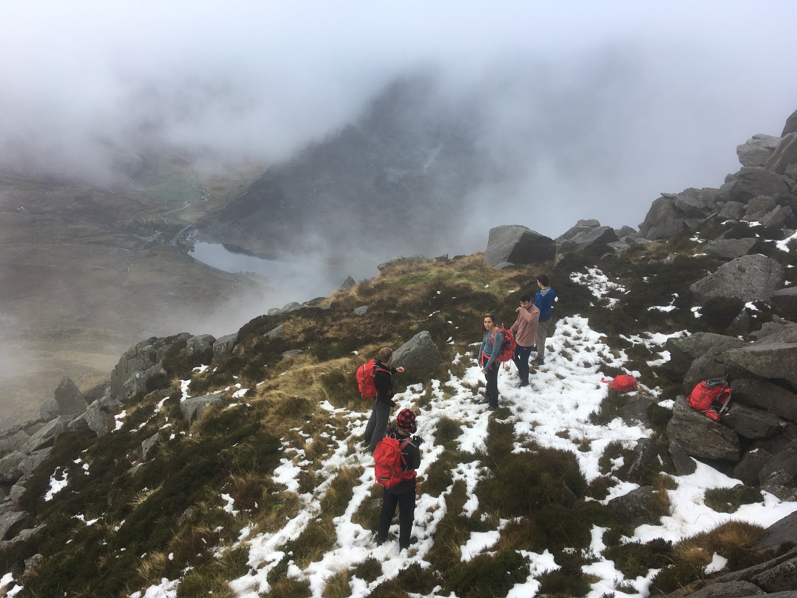 There wasn’t much to see for much of the day today. The clouds and mist hung low, without a wind to move them on. Tryfan was our mountain of choice today. Cold, damp and slippery conditions meant that another peak would have been a more sensible objective, but if the aim of the day is to climb Tryfan, then a nearby mountain won’t quite do.