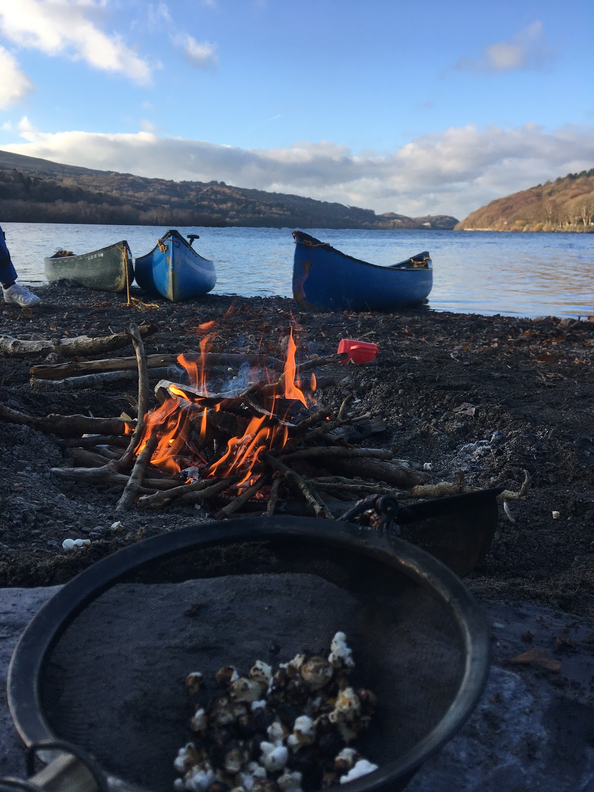 Before reaching our chosen landing spot, we came across some well dried out driftwood, so loaded up our boats so that we could get a campfire going once on land. It was just the right day for such a thing and we huddled around for warmth and did our best to toast some pop-corn, but it always seemed to come out a bit ‘flame-grilled’.