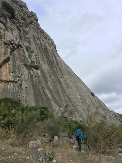 Despite the forecast predictions of a grey and wet day, we optimistically set off to our local crag – the big slabs of Turon. The drive there was easy and quick, although we did hesitate momentarily before turning off the smooth tarmac to descend the track to the nearby farm as a huge, deep looking muddy puddle looked big enough to loose the hire car in. After a depth inspection by Clare, using a stick from a nearby tree, it was deemed an acceptable risk and sloshed through with only some mud splashing on the white exterior.