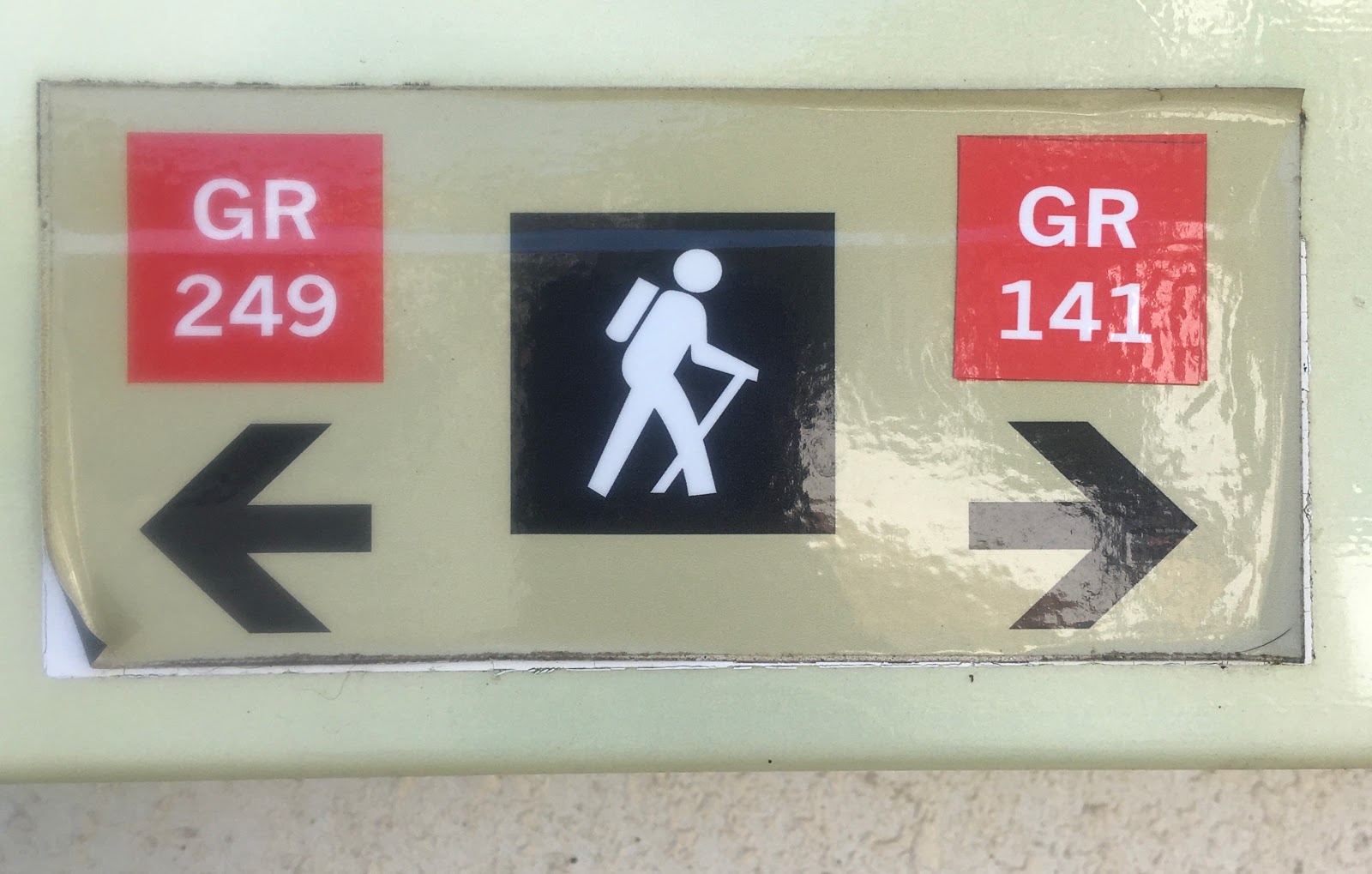 The platform and station building were deserted and looked like they might have been for some time. Once we’d got our bearings, we found encouragement in this tiny sign, on a telegraph pole. We were on the right track!