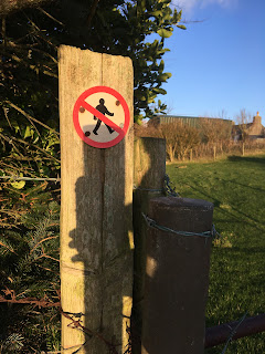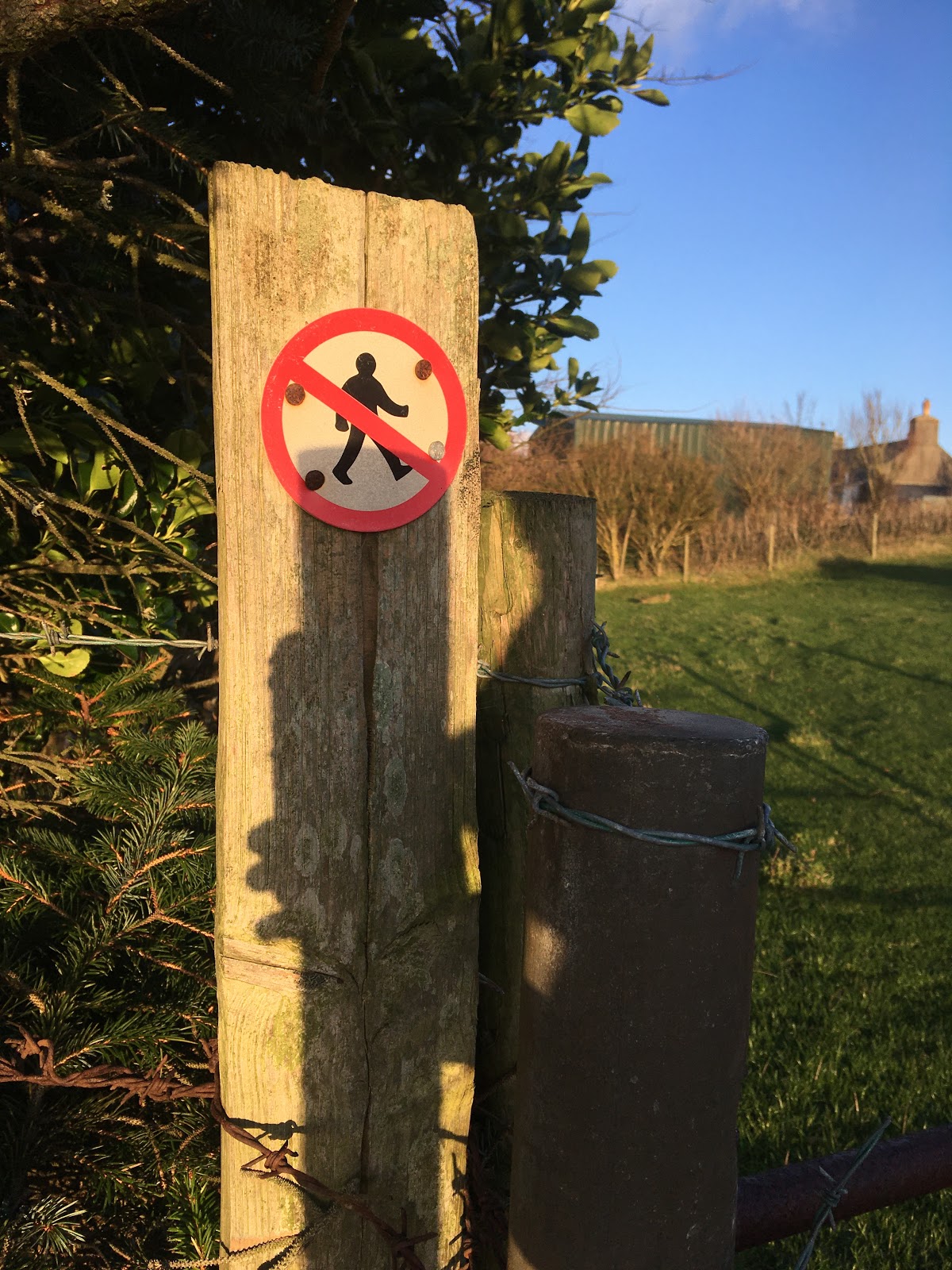 After passing some large horses, followed by a field containing two pigs and a large lady dressed in pajamas and wellies, we also had to admit defeat at the sight of this sign. Thankfully, a further search revealed a ‘yellow arrow’ footpath marker indicating the direction of our salvation from underneath the grasp of a dense bramble bush.