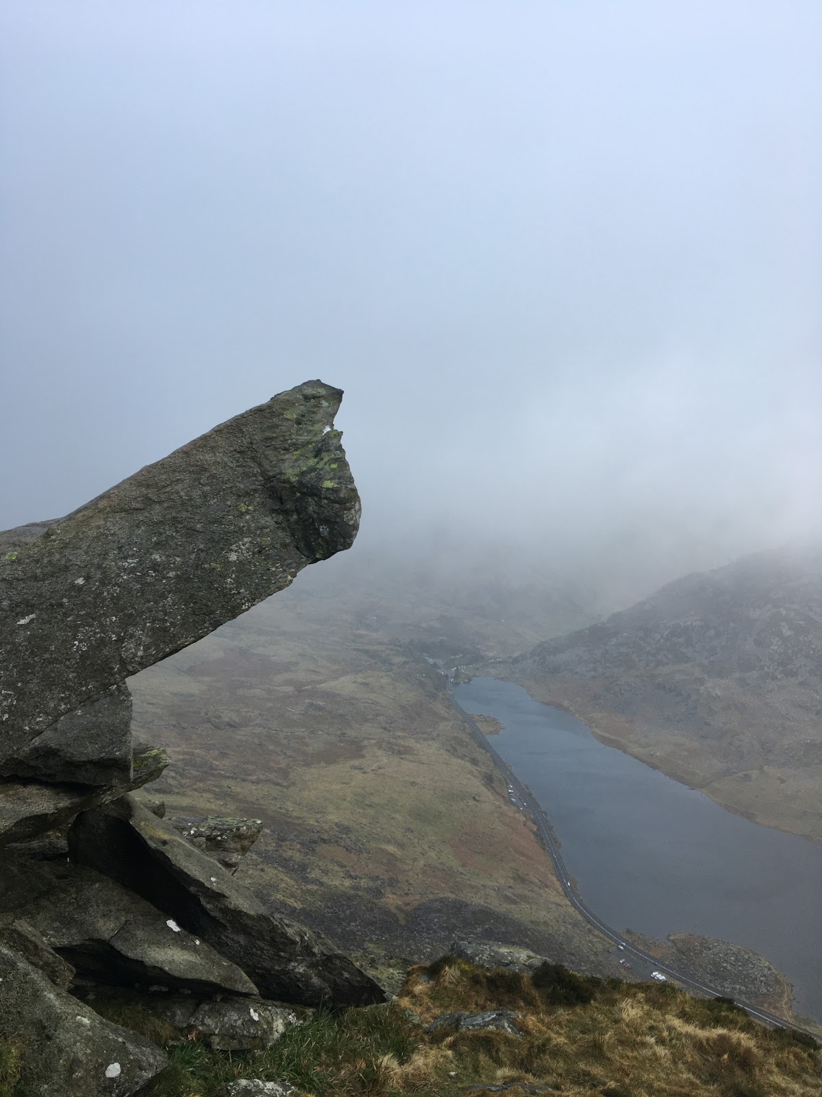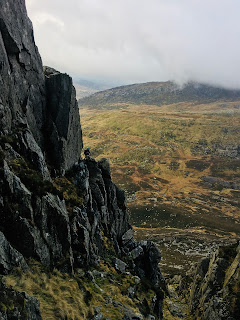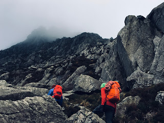 While Aled stayed out on the crest, my team moved into the gully on the left of the ridge to try and gain a little shelter and be able to move faster – it was not a day for three people to be hanging around on small ledges. At the top of the climbs, we regrouped on the North Ridge. The mist was down and rain threatened to fall at any moment. We decided to give the summit a miss and descend the North Ridge instead.