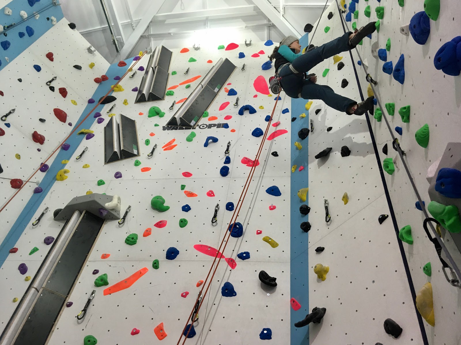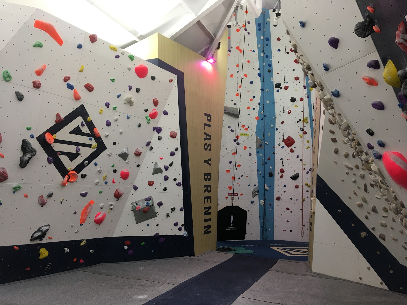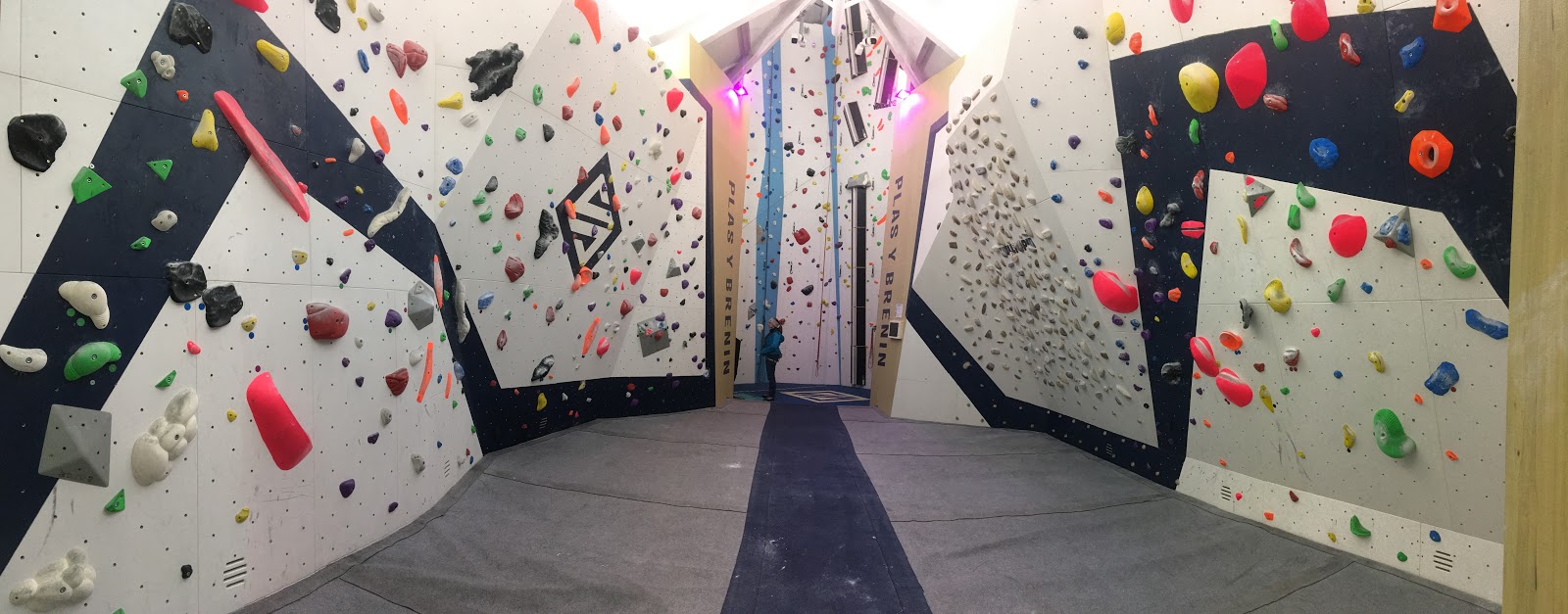 Finally got the chance to check out the new climbing wall at Plas y Brenin today. It’s been a long time coming, but on a torrentially wet day, accompanied by gale-force winds, it seemed reasonable to head there during daylight hours. Everything is super fresh inside, including all the holds, which are grippy as corse sandpaper. They’ve obviously spent a bit of money on the place, including a few extra frills, like lights that change colour every few minutes (kind of cool?!) and at least eight CCTV cameras (kind of un-nerving!).