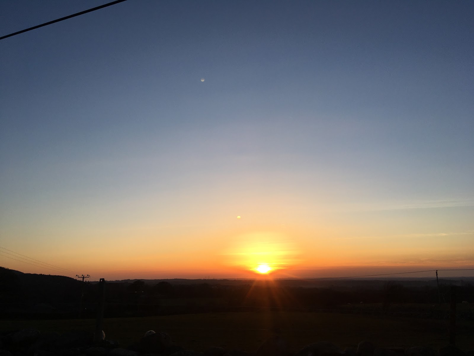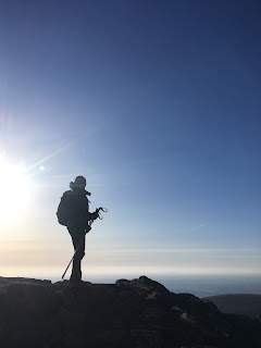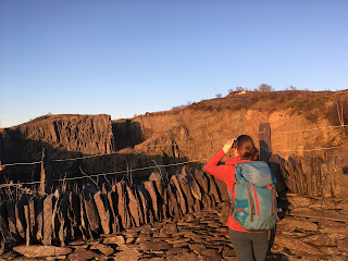 We descended towards a lowering sun, feeling it’s warmth. (it was 15 degrees when we left home!). On the way down, Clare spotted a Sparrow Hawk coming into land on the cliffs. Luckily, I had a pair of Uncle Ken’s binoculars in my pack, so we were able to see it on it’s nest.