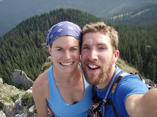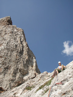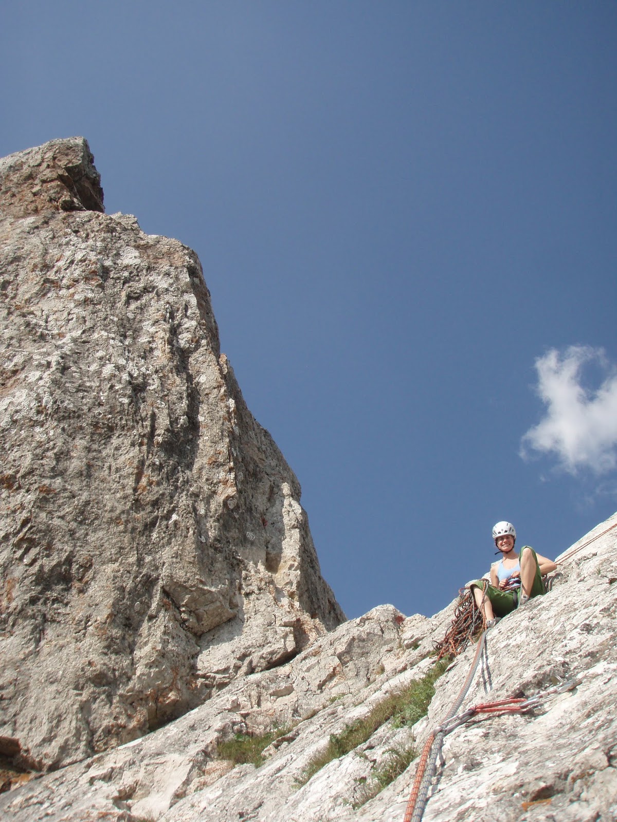 Clare brought me up to a belay perched on the ridge after running the first two pitches in one rope length. Above lay a series of cracks, festooned with all manner of rusty looking pitons. As I made my way upwards, I was surprised and pleased to find that most of the fixed-gear was surprisingly solid. It was however, reassuring to be able to place our own protection as well. At around six pm, I pulled up onto the small section of flat ground of the summit that was marked by a weathered, wooden cross. With a fist raised to the sky I punched the air and gave a whoop, utterly overjoyed to have made it! Clipping myself to an anchor, I belayed Clare up while marveling at the multi-directional panorama and grinning like an idiot. Clare soon joined me on the small perch where excitable hugs and high fives were exchanged and numerous photos taken.