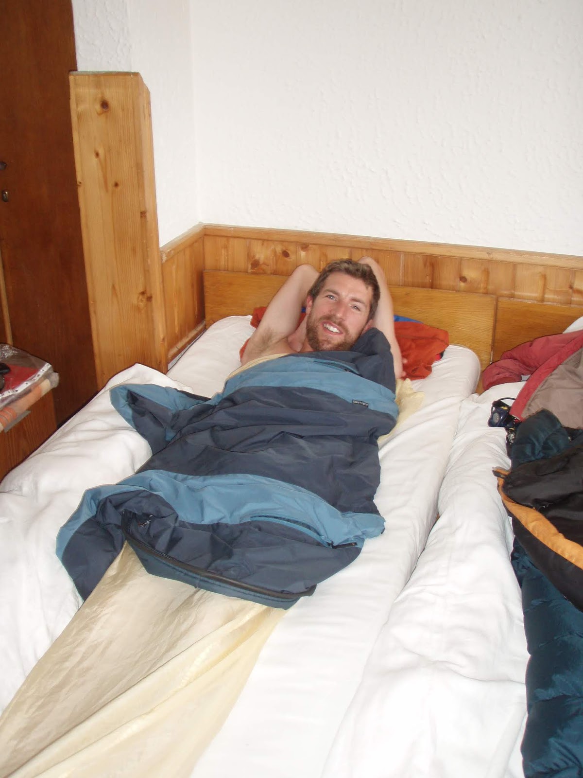 Contender for worst bed in the world – the duvet is rolled up underneath me to counteract the saggy mattress. |