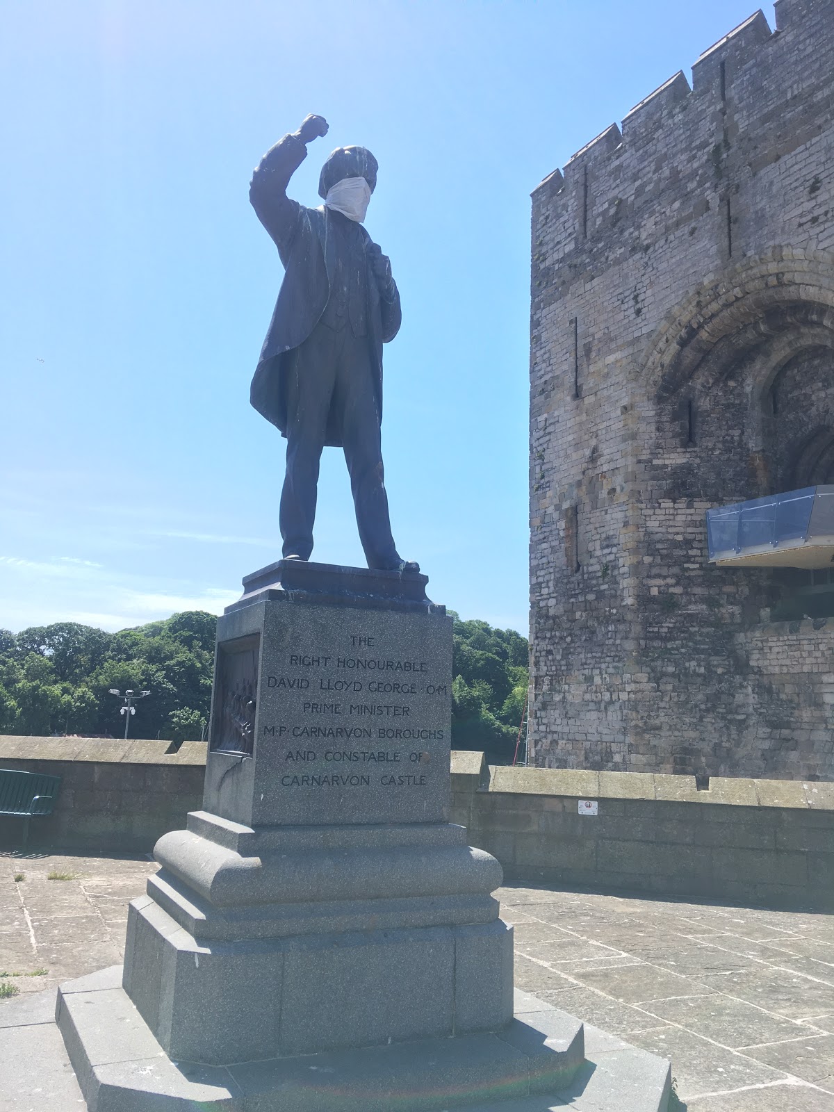I did pull over in the town square, where some joker had given Lloyd George some PPE!