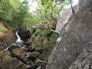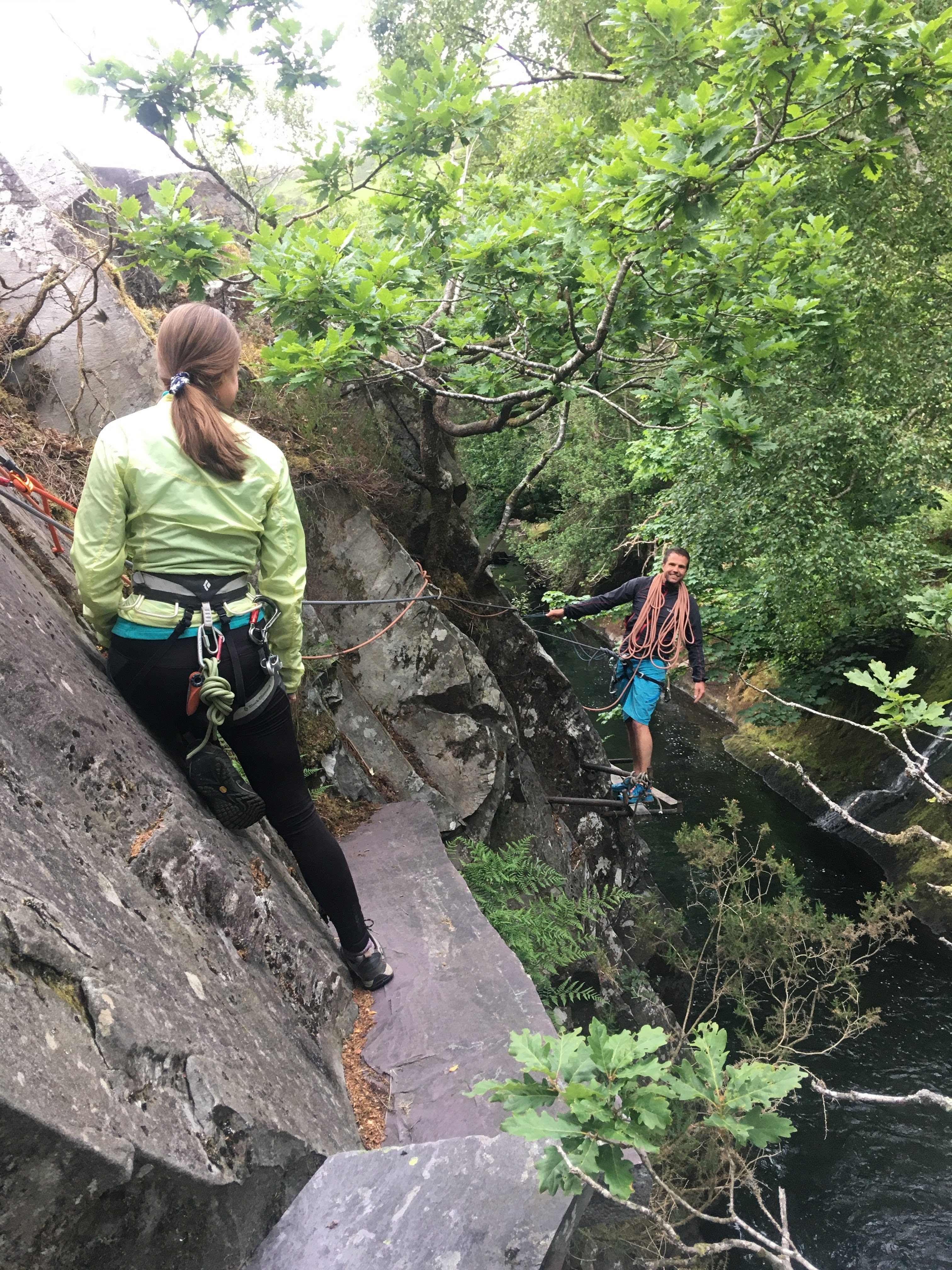 It was super exciting to be arriving somewhere new, by bike, with a pannier full of rope and hardware. The rain had held off. It all felt very exploratory as I gingerly made my way across the slate slabs, which had been held in place by old iron stakes. Whoever put this up all those years ago, had gone to some considerable effort.