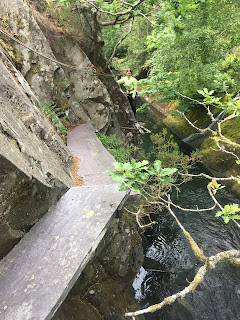 In places, the slate slabs were missing and I had to balance along the metal stakes, or traverse a wooden plank which had been added as a replacement. Towards the end, a rotten beam hung forlornly down, clinging on by an equally rotten bit of string. Some delicate rock climbing got me past it and onto the better-looking slate walkway.