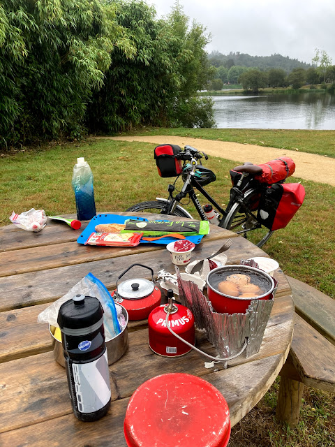 We each had two rear Ortlieb panniers and a small drybag over the rear wheel as well as a handlebar bag. Tent, sleeping bags, therm-a-rest (and chair kit) and a small tarp blanket provided our living area. A Primus gas stove (small enough to pack inside a tiny Trangia kettle), a nest of two pans and two folding plates were accompanied by three sporks (one each and a spare) and of course, an Opinel penknife, provided for all our cooking needs.