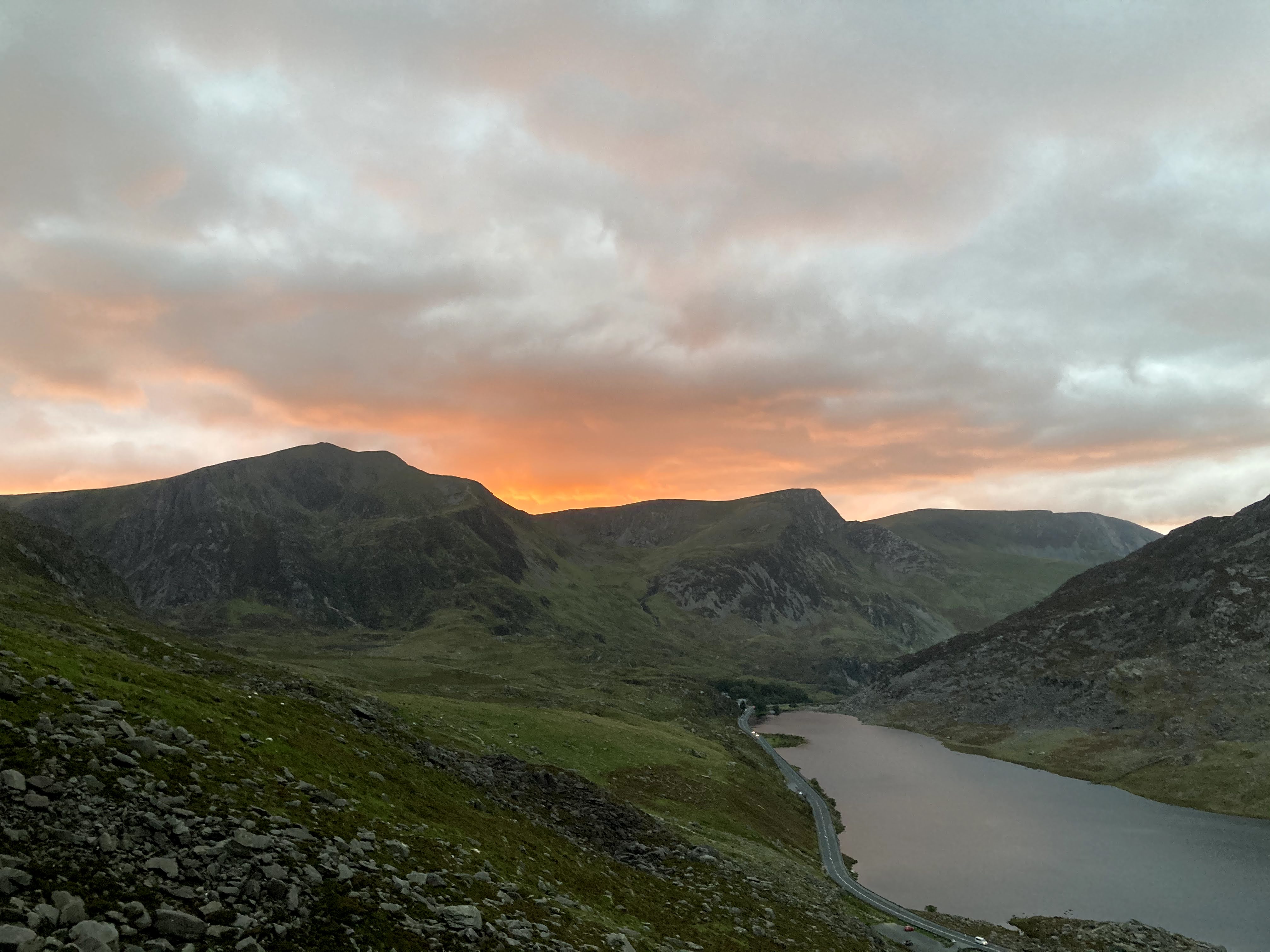 Following a day spent mostly at a computer screen, I was iching to get out climbing this evening. Time was against me, but I just managed to get up and down Milestone Buttress before dark. It was looking a bit gloomy, but I got a sudden light show ‘glow’ over Y Garn at dusk.