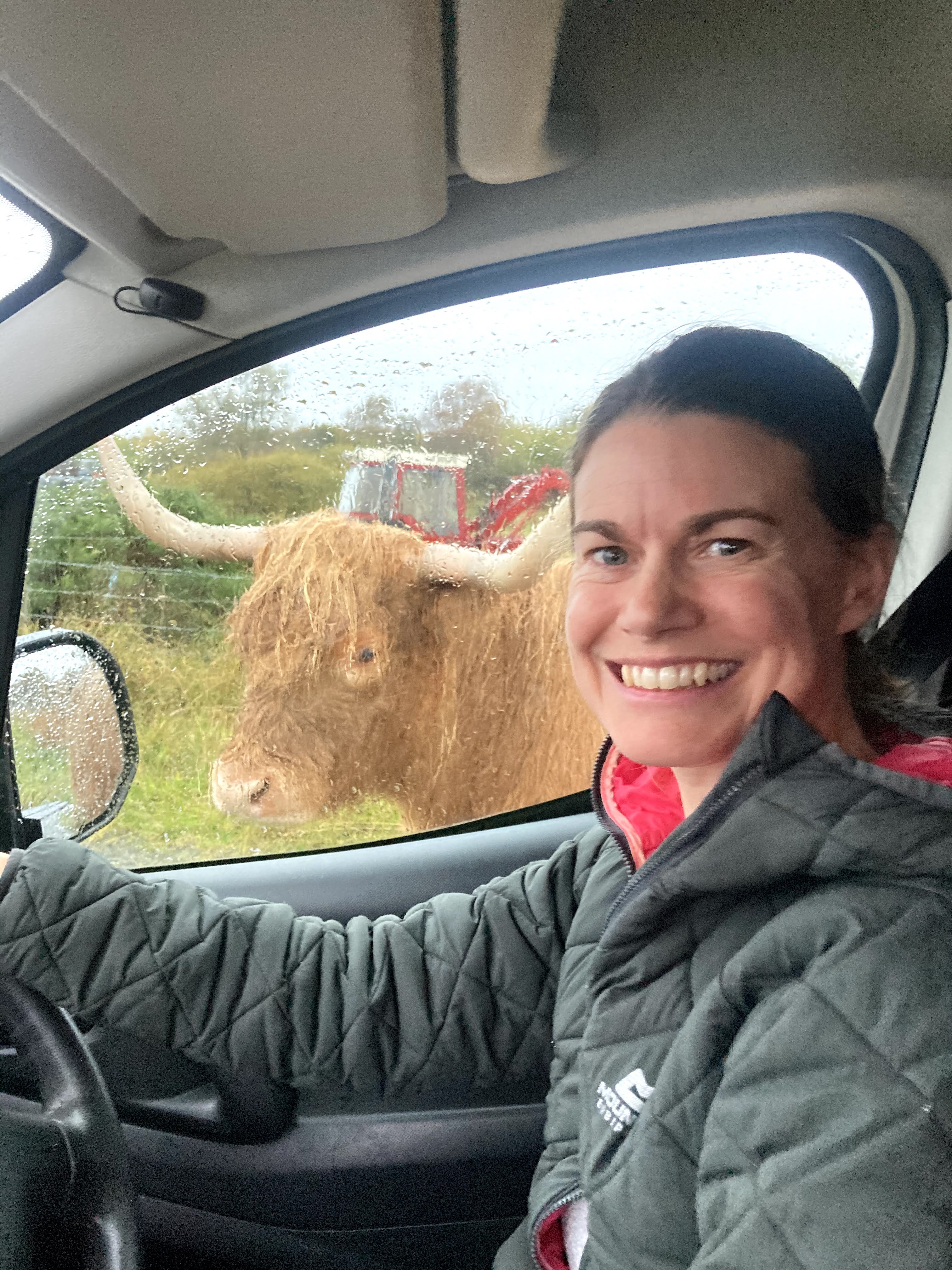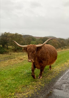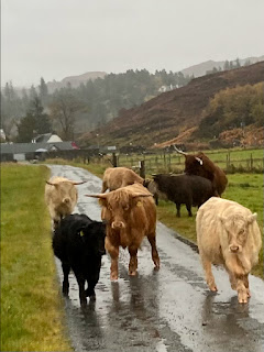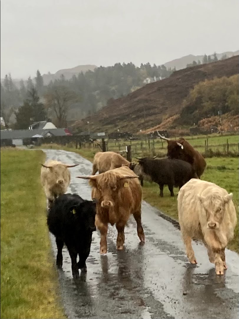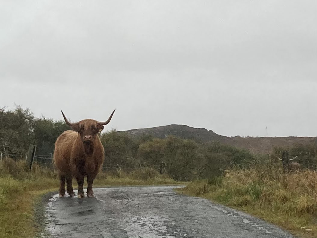 Given the rain, we set out in wetsuits and warm hats and went pretty much from the house, out to an island in the bay called Sgeir Bhuide. From the island we had really good close-up view of Duncraig Castle on the far shore. It’s an incredible looking place that’s now a very nice looking hotel (google it!). Having returned back home along the sheltered sea front of Plockton, we dived straight into a hot shower to warm our toes back up, then after a bit of lunch, set out for a bit more exploring. We wanted to check out a few more paddleboarding areas and beaches. Heading down to one such dead end road, involved passing by a herd of Highland Cows.