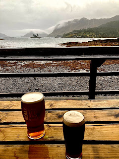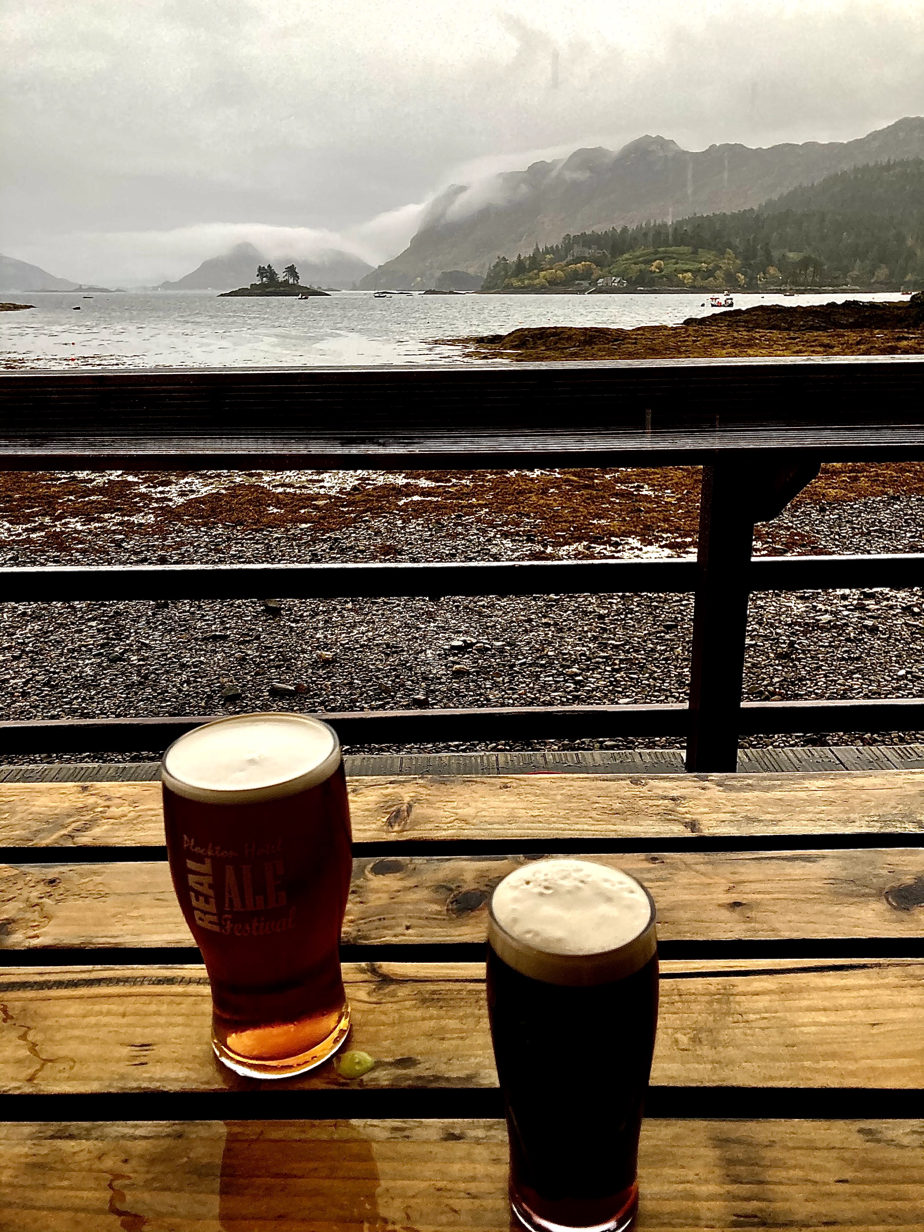 We saw the bridge over to Skye, but saved that for another day, instead we chose to return to Plockton and have a drink at the Hotel. They have one of the best view a beer garden could have and had put up a tarp tent to offer a bit of protection, but it did little to keep the rain off. It was slightly absurd, but very fun to stop off for a drink. An older couple were also braving the elements and directed us towards the complimentary jay cloths for wiping away the puddles on the benches! It’s not often you go for a drink in full waterproofs and thermals in a monsoon, so we revelled in the craziness of it before returning home for a much warmer dining experince.