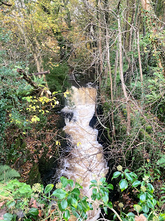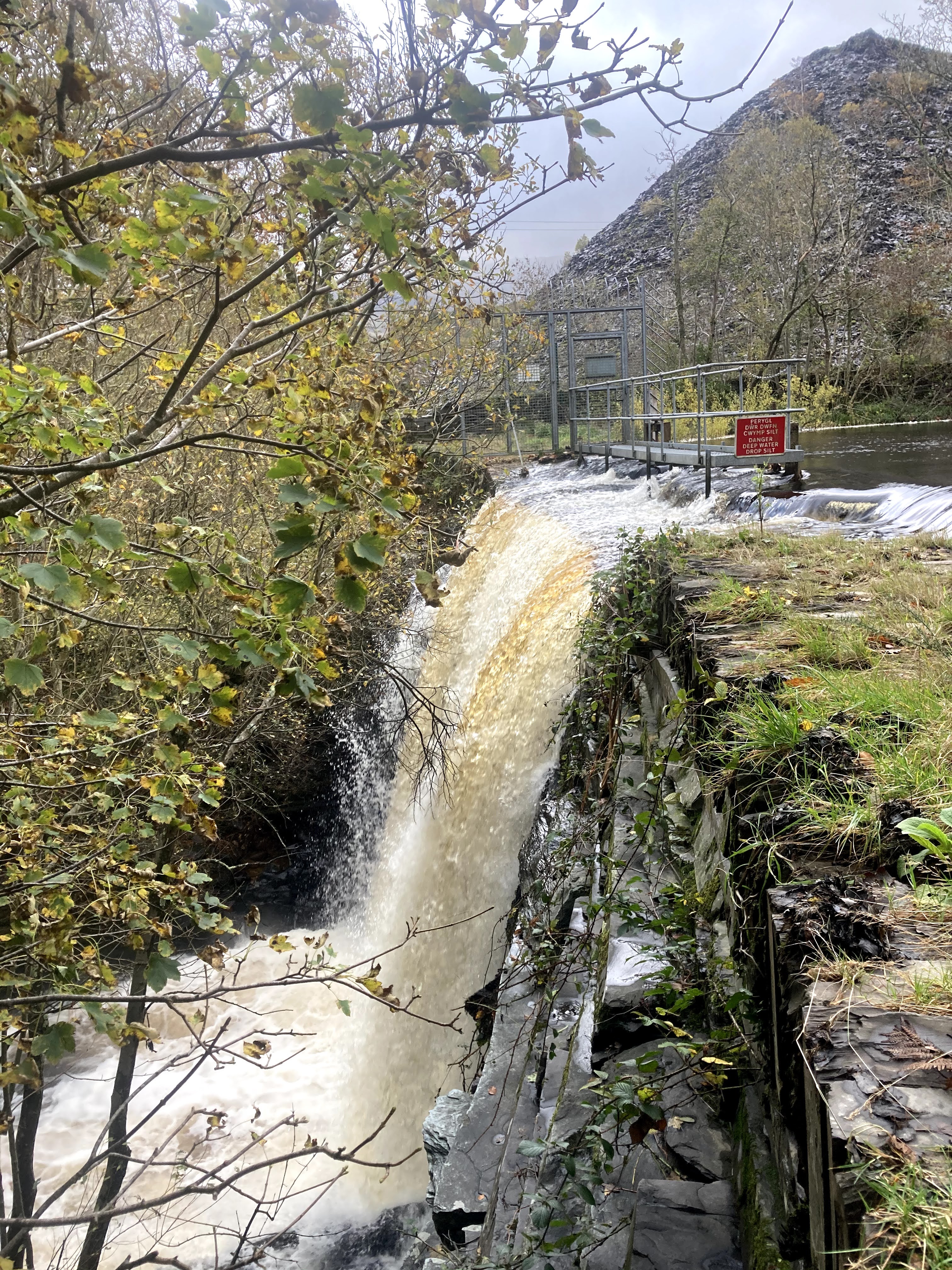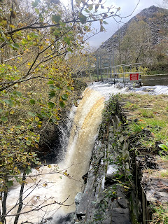 Further up the hill, the reservoir was looking pretty full and with an impressive overspill.