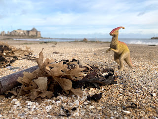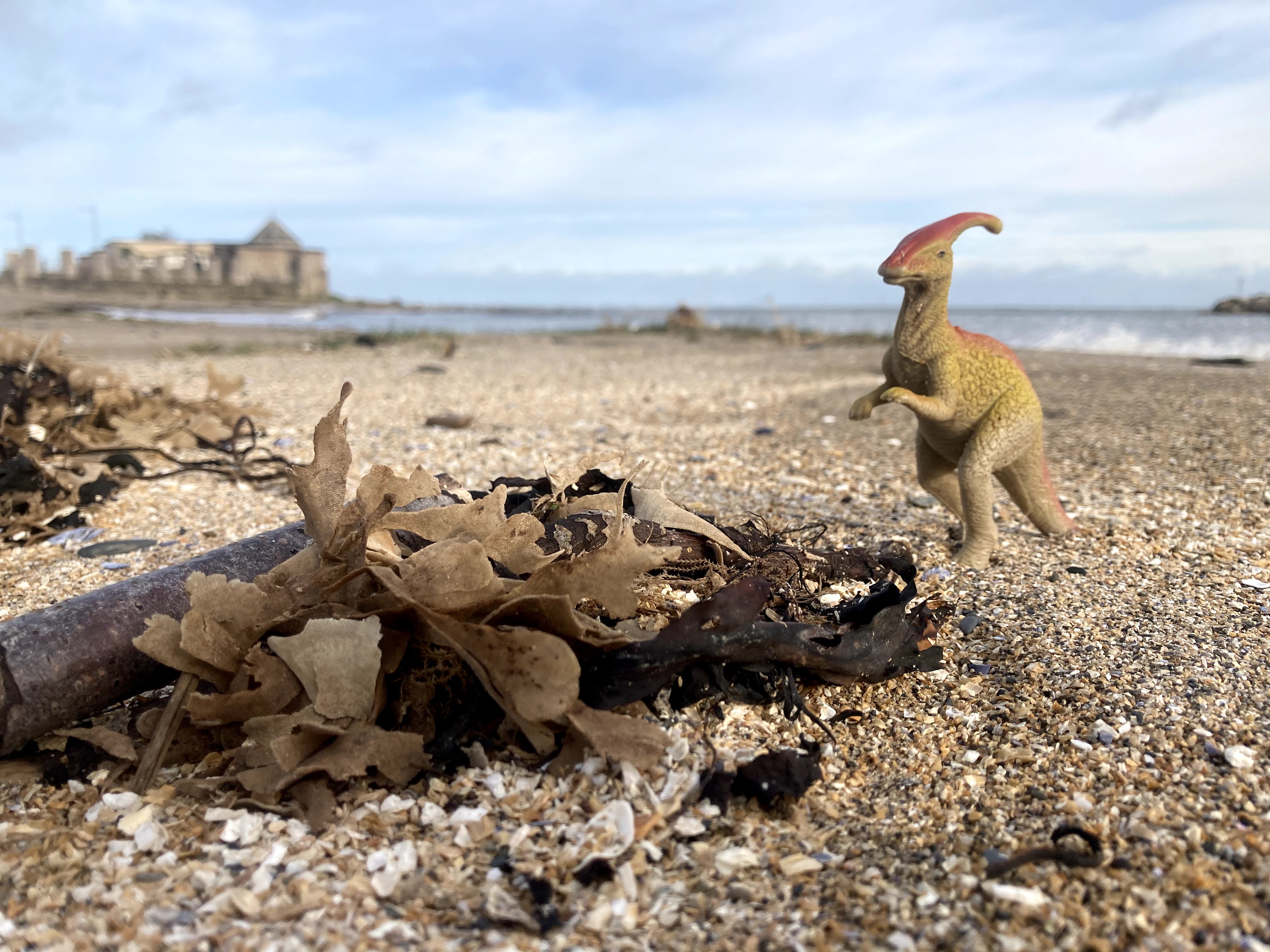 Rather than head straight off, we took a walk along the promenade and beach area. The sun felt warm and it was like we’d been transported to a different place as behind us in the mountains, we could see the towering black clouds above the hills. We made our way along the high tide line where all sorts of debris had been washed up. This guy made us chuckle before we headed off to find the new crag.