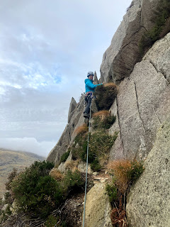 With only a 30m rope, we move quickly in short pitches across the cliffs and up onto the top of the crags. We descended the Milestone Gully instead of walking off. It seemed like a good idea until I remembered that it had rained all day yesterday and parts of the gully was puring with cold water run-off. Had numb fingers by the time we got down.