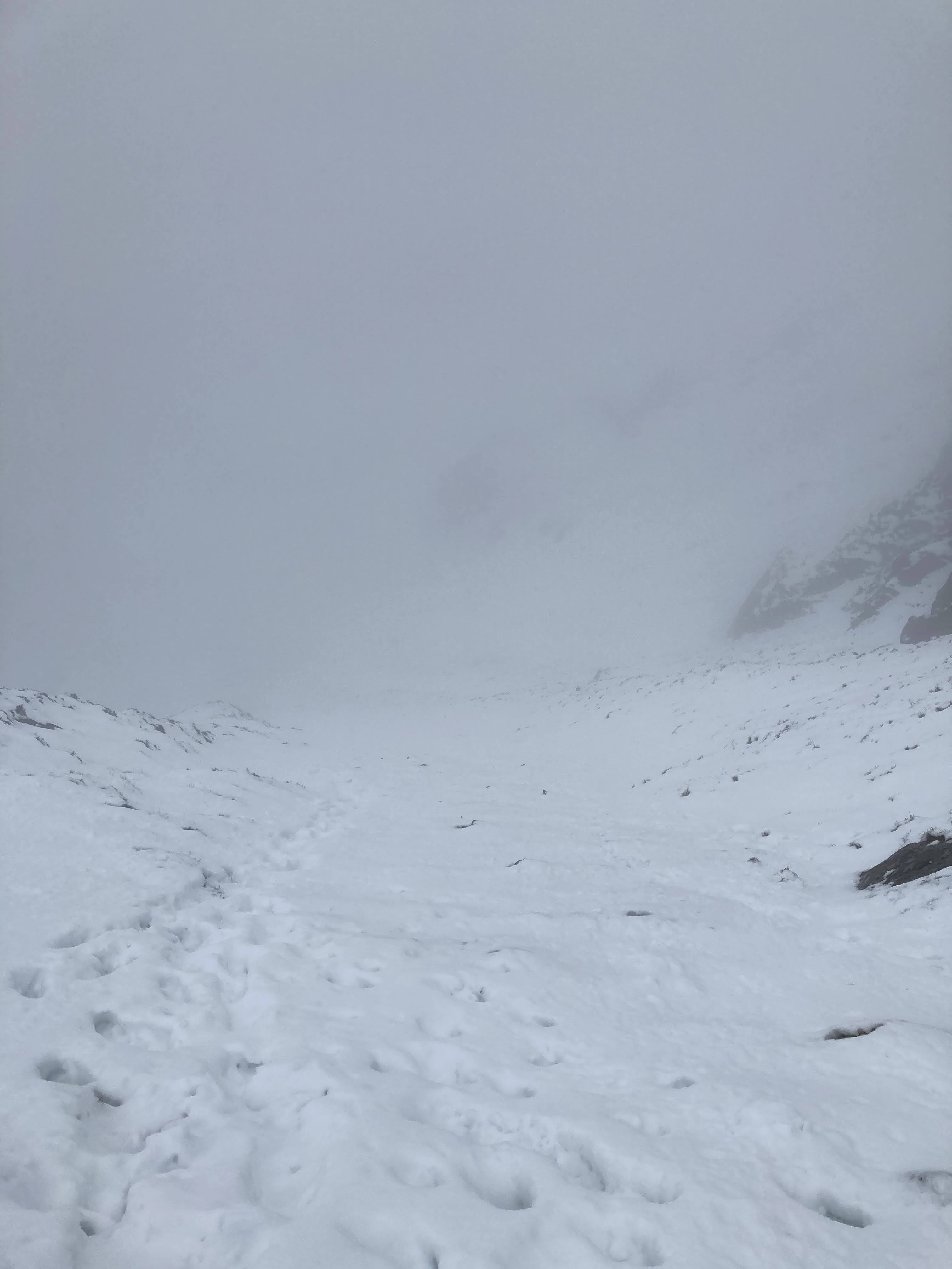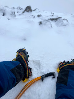 The views were not far-reaching, but I knew where I was going and enjoyed the movement as I kicked my front points into secure and sticky snow. I made sure to keep my focus and follow the safest passage as I was sheltered from the westerly wind and knew that this could mean a build-up of unstable snow as it blew in over the summit ridge. I was grateful that there wasn’t much of a cornice at the final headwall and I easily climbed onto the summit slopes. As soon as I stuck my head over the top, the wind blew cold and directly at me. I went quickly up to the summit cairn to shelter behind it and enjoy a hot drink.