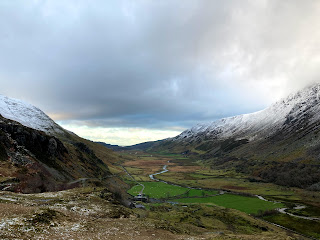 Having topped out onto easier ground, the map, compass assisted me in locating the summit and then the shelter cairn. I’ve been using mapping software on my phone a lot over this last year, but the traditional map and compass win hands down when it comes to winter navigation as the last thing I wanted to do while stood bracing against the horizontal snow was unzip my coat, then take off my gloves to try and get my phone unlocked! About fifteen minutes into my descent, I broke through the base of the clouds and suddenly the valley and all it’s familiar features revealed themselves.