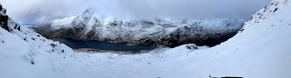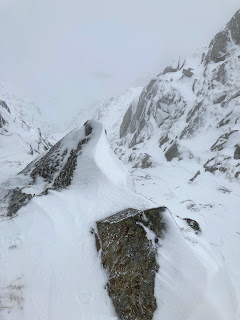 I had several objectives in mind for the day, so that I could go for the one that suited the conditions best. Ideally, once I got into the higher cwm, I’d had had some snowshoes as at times I sank up to my thighs in drifts, if I misjudged my route choice. The gullies were filling up with really soft snow, so I had to stick to rockier ribs and ridges to be able to climb upward. ‘Having a look’ into one of my favorite routes, was like saying hello to an old friend that I’d not seen for a while. Each year it takes on a slightly different form, with the snow and ice creating different shapes and flutings. I decided to climb up – partly because I didn’t fancy going back the same way and partly, for the adventure.