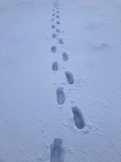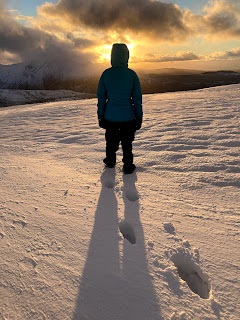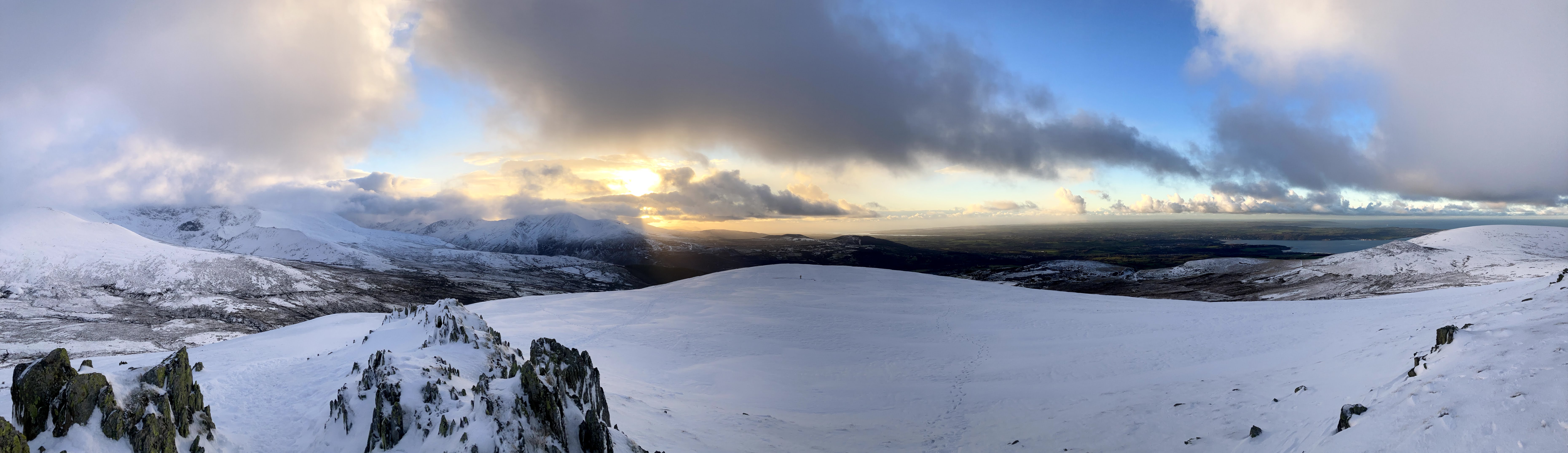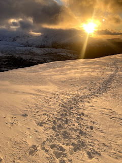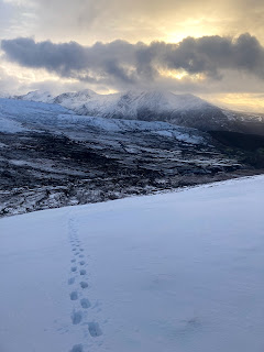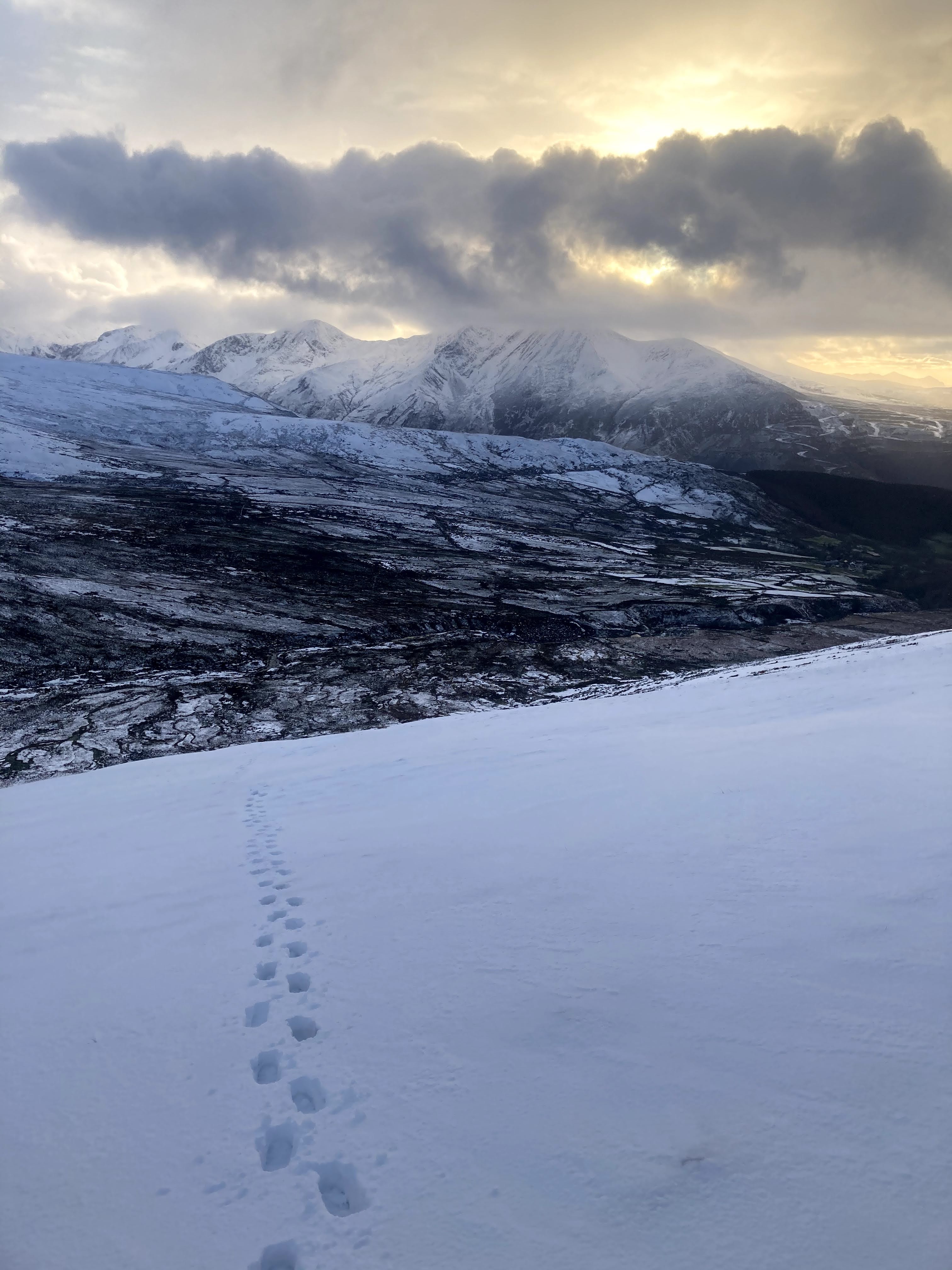 After cycling uphill for as far as the tarmac would allow above Bethesda, we continued on foot around the base of Gyrn Wigau, a peak that we can see from the bedroom window. After a boggy start, we hot the south-facing snowfield and began kicking steps up towards the summit in untracked snow.