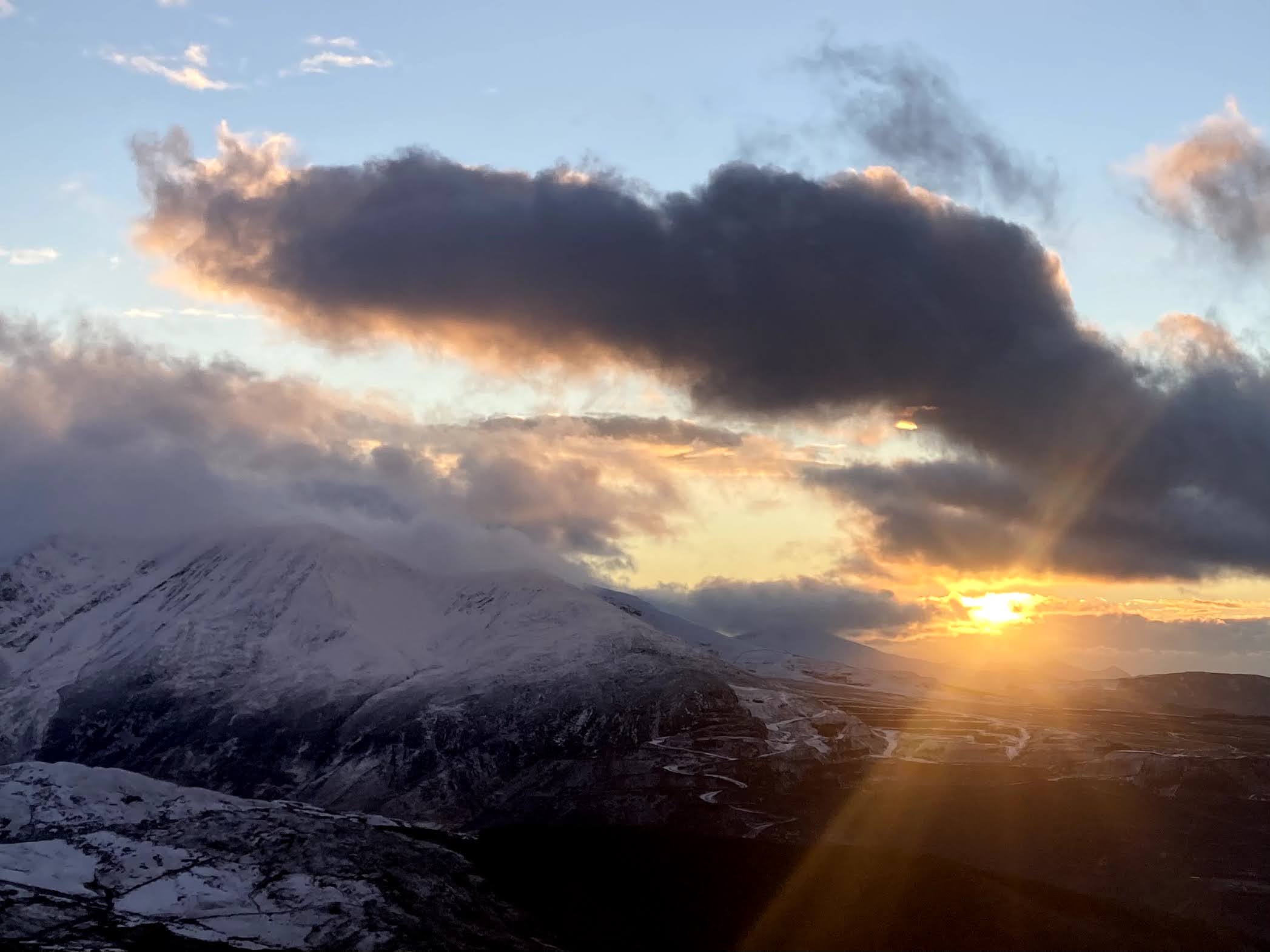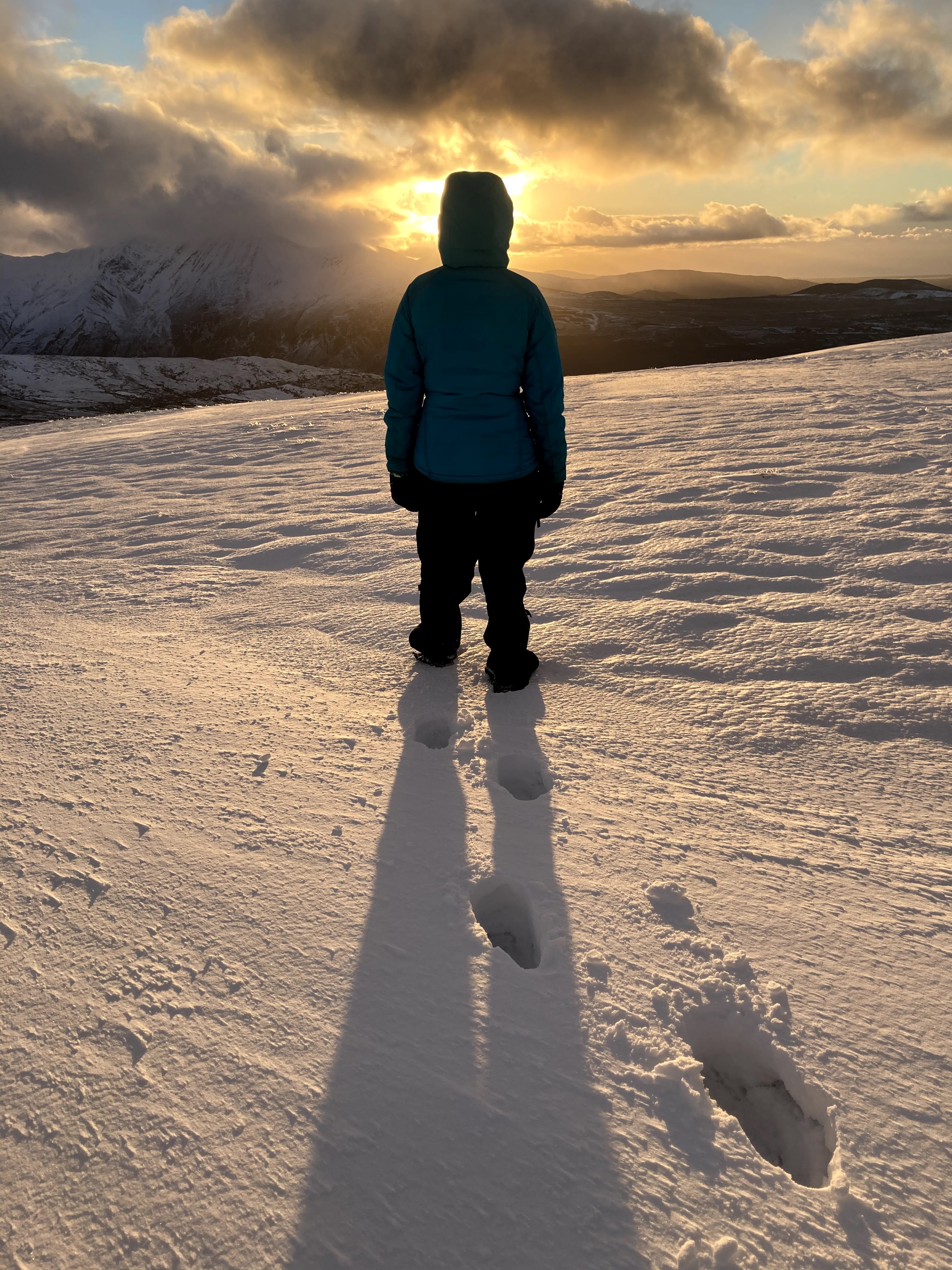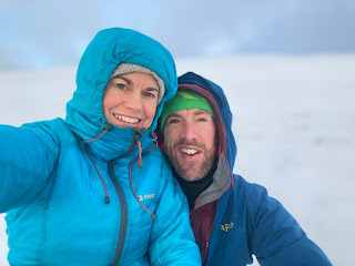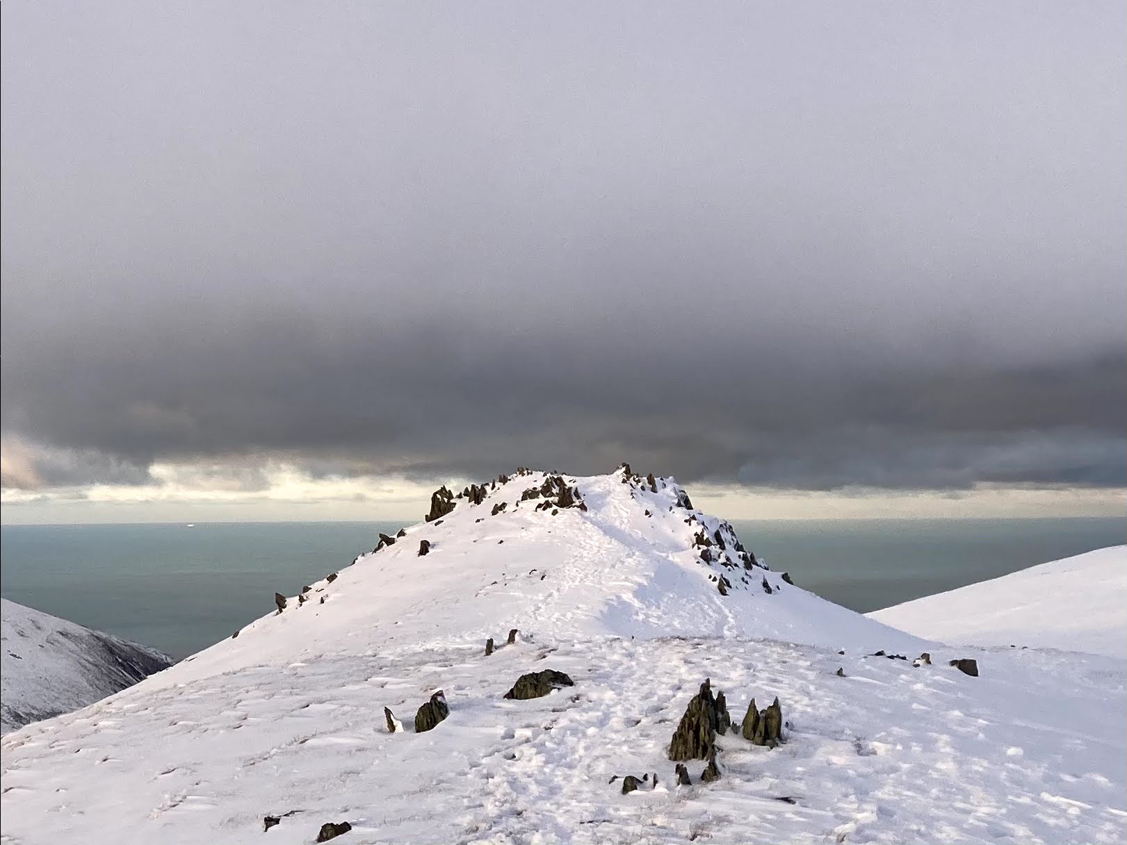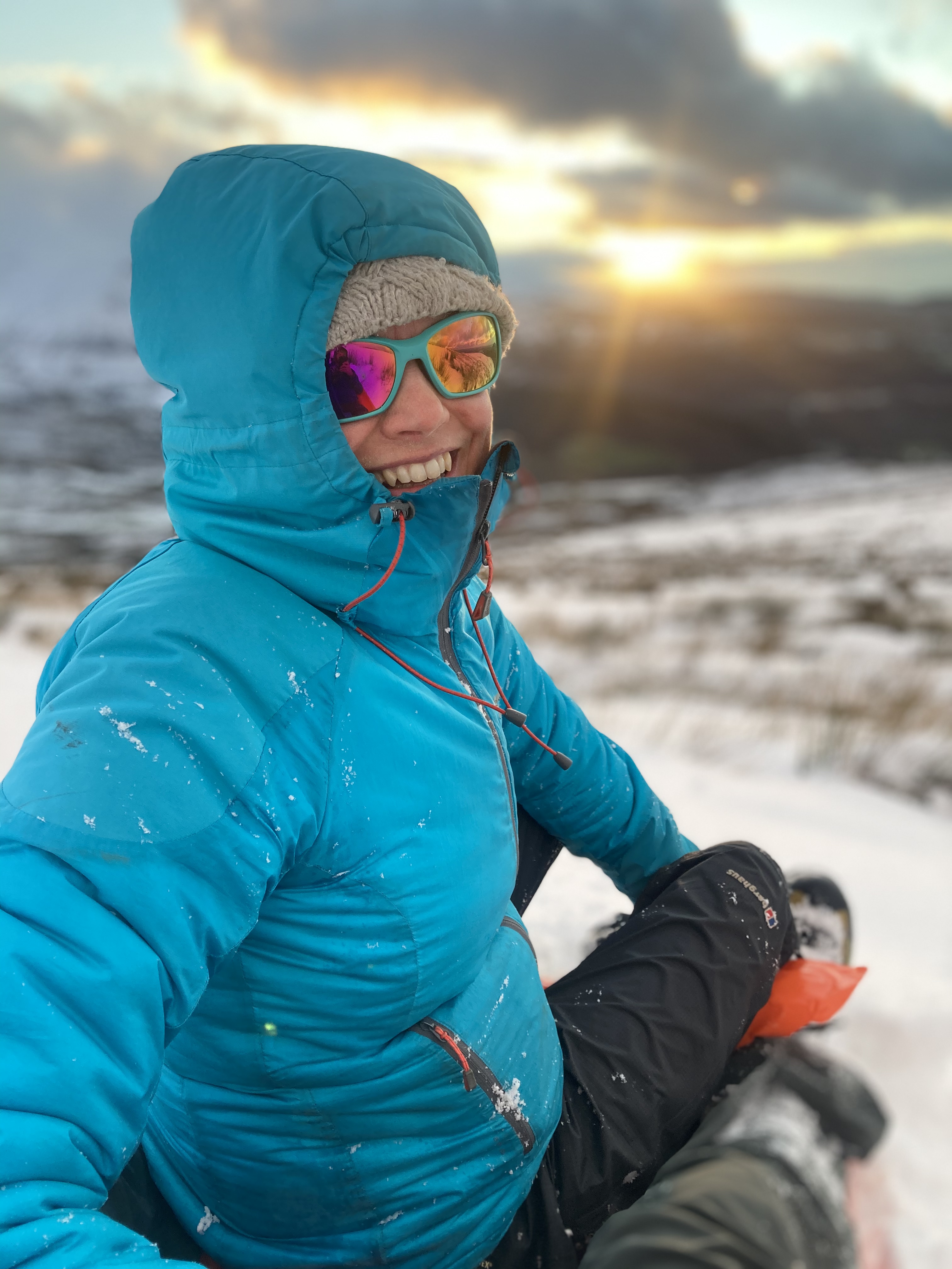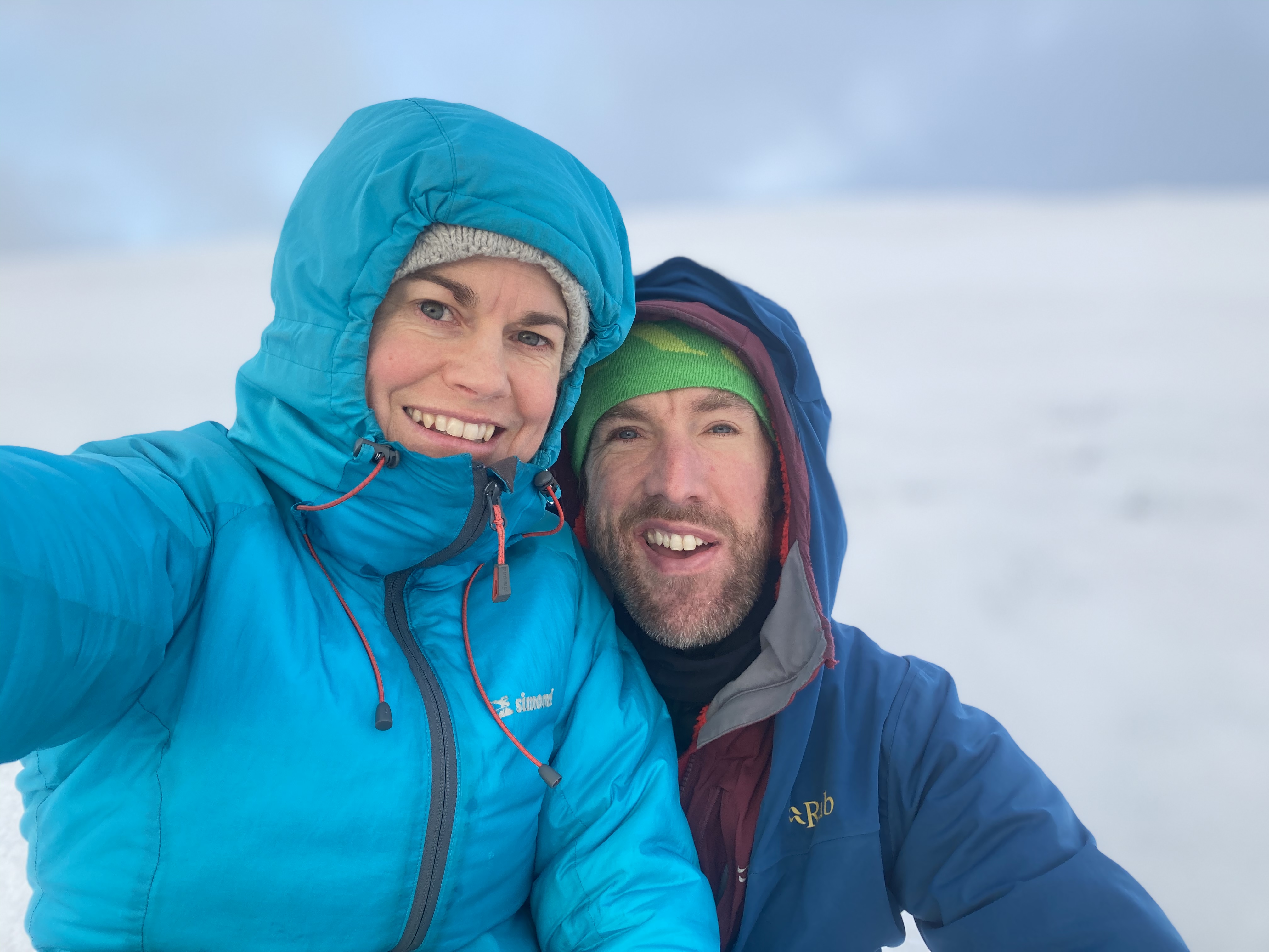On reaching the steeper west-facing section, having not got skis with us, we pulled out our secret weapon – a heavy-duty orange bivi bag and sledded down the snowfields at high speeds through the soft snow.