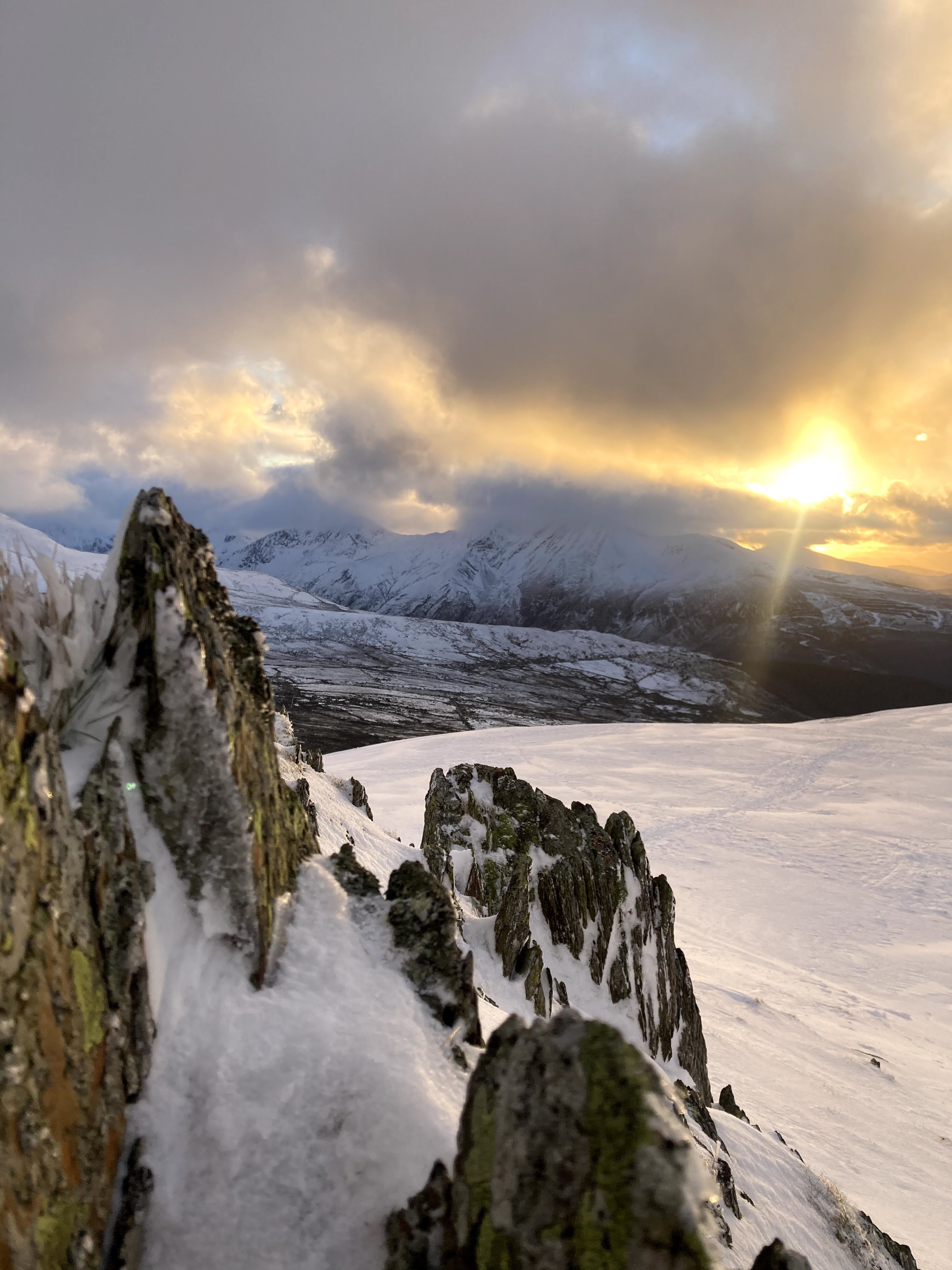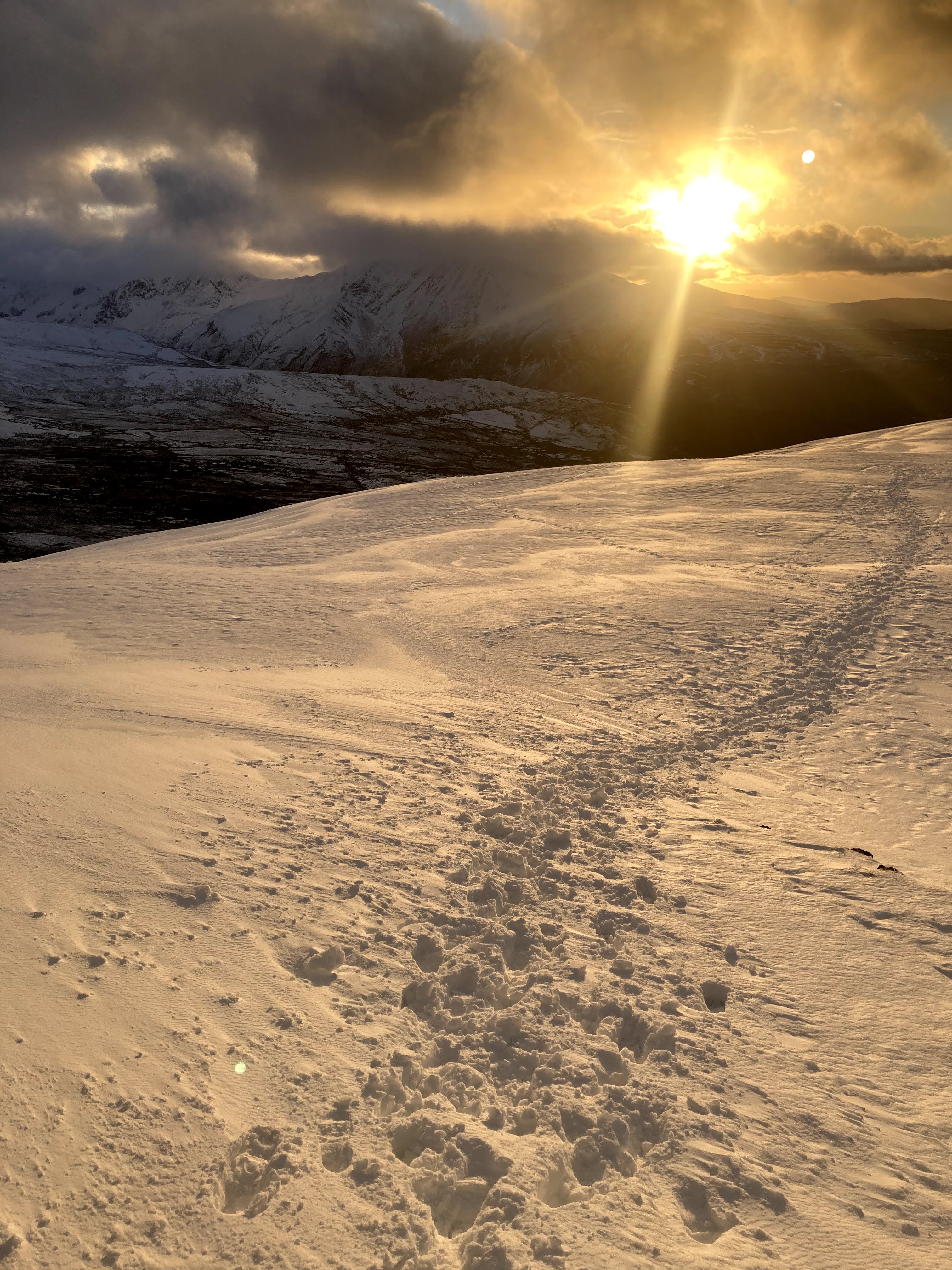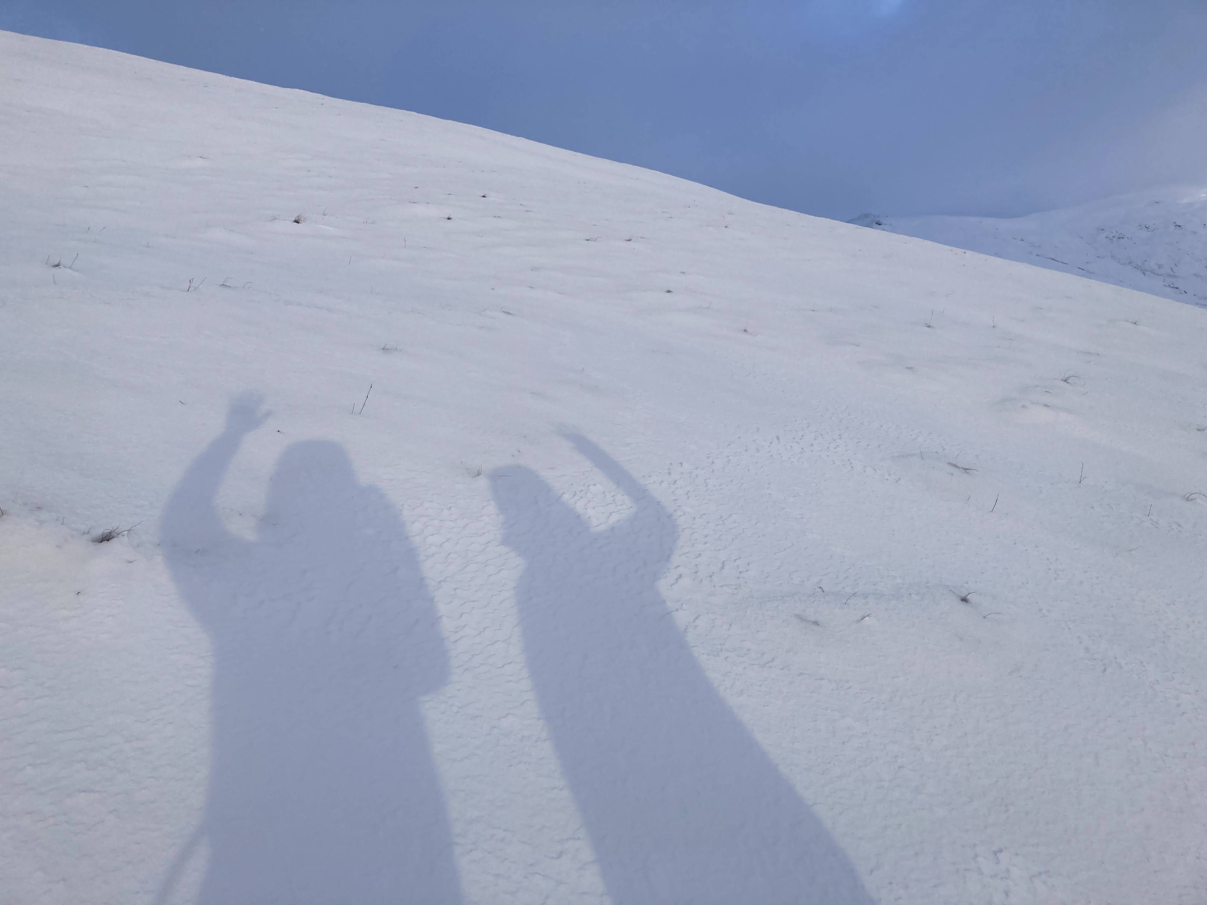 It was a hilarious descent, with the two of us hugging together with snow spraying overhead. Eventually, we ground to a halt as the angle eased laughing our heads off.