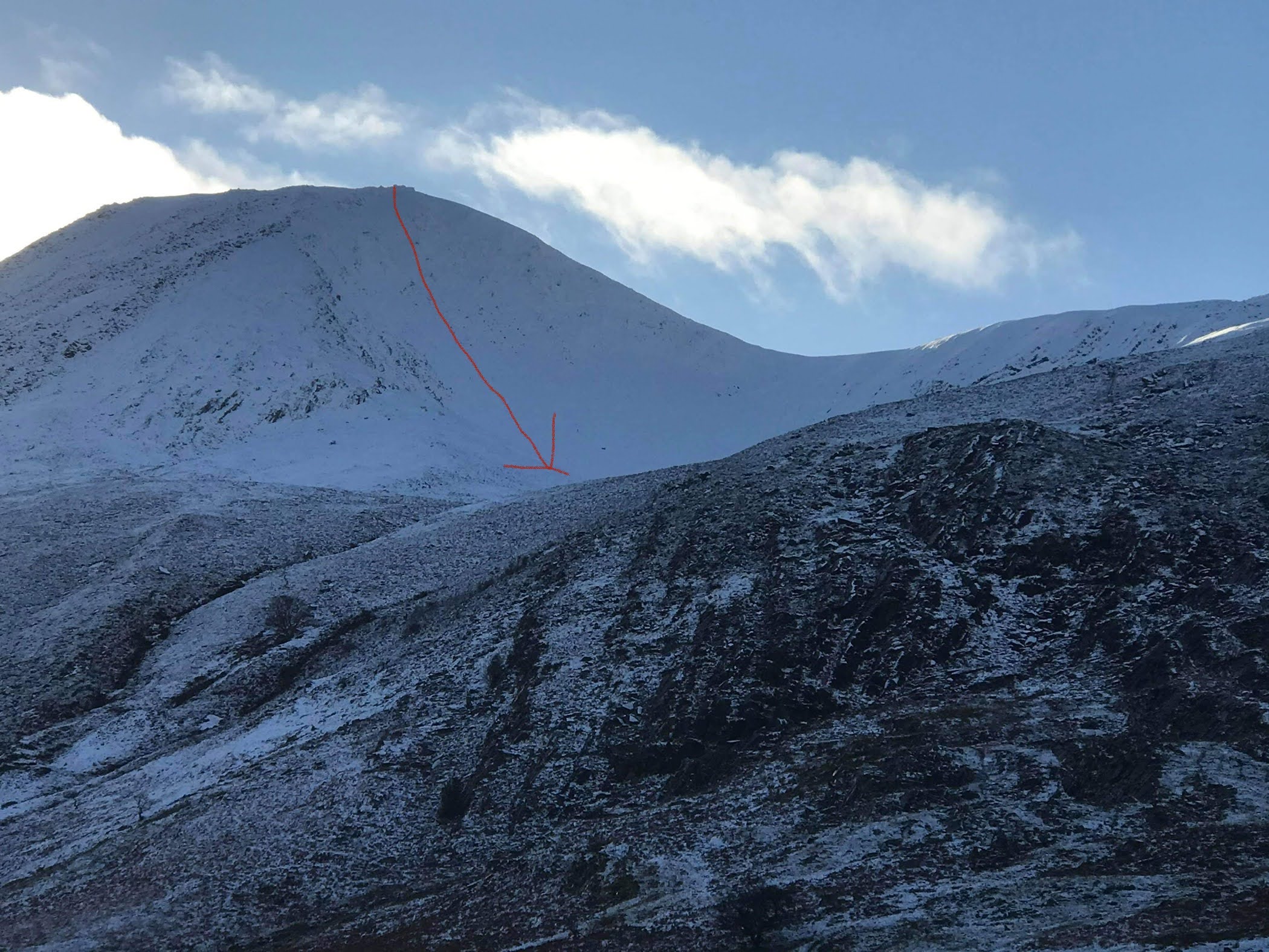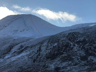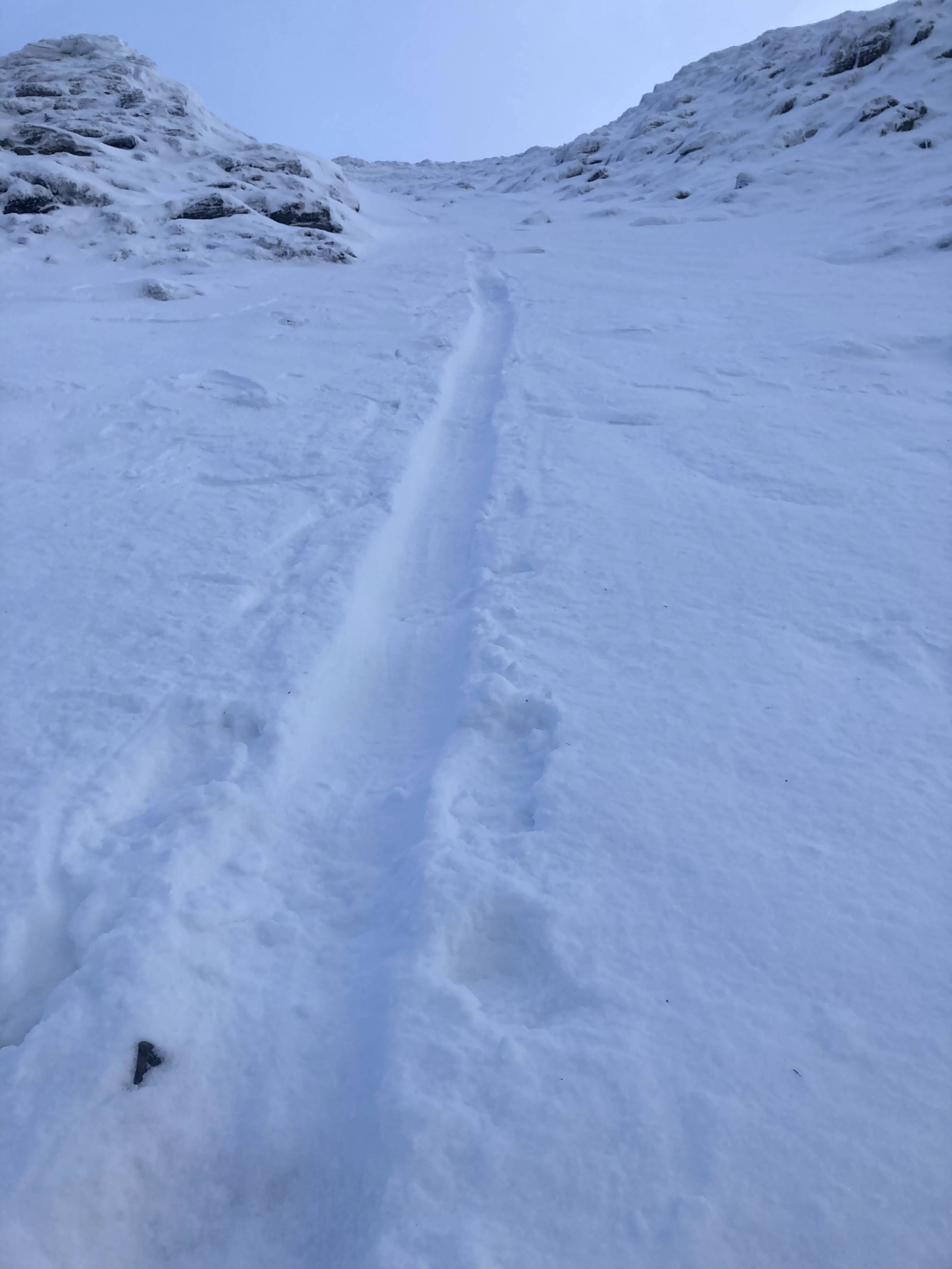 As well as the ridge I’d climbed, I’d also eyed up this gully with leads almost directly off the summit. With the aid of my trusty orange bivi bag and using my ice axe as a break, I shot down the gully at tremendous speed.