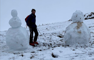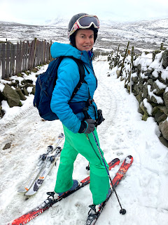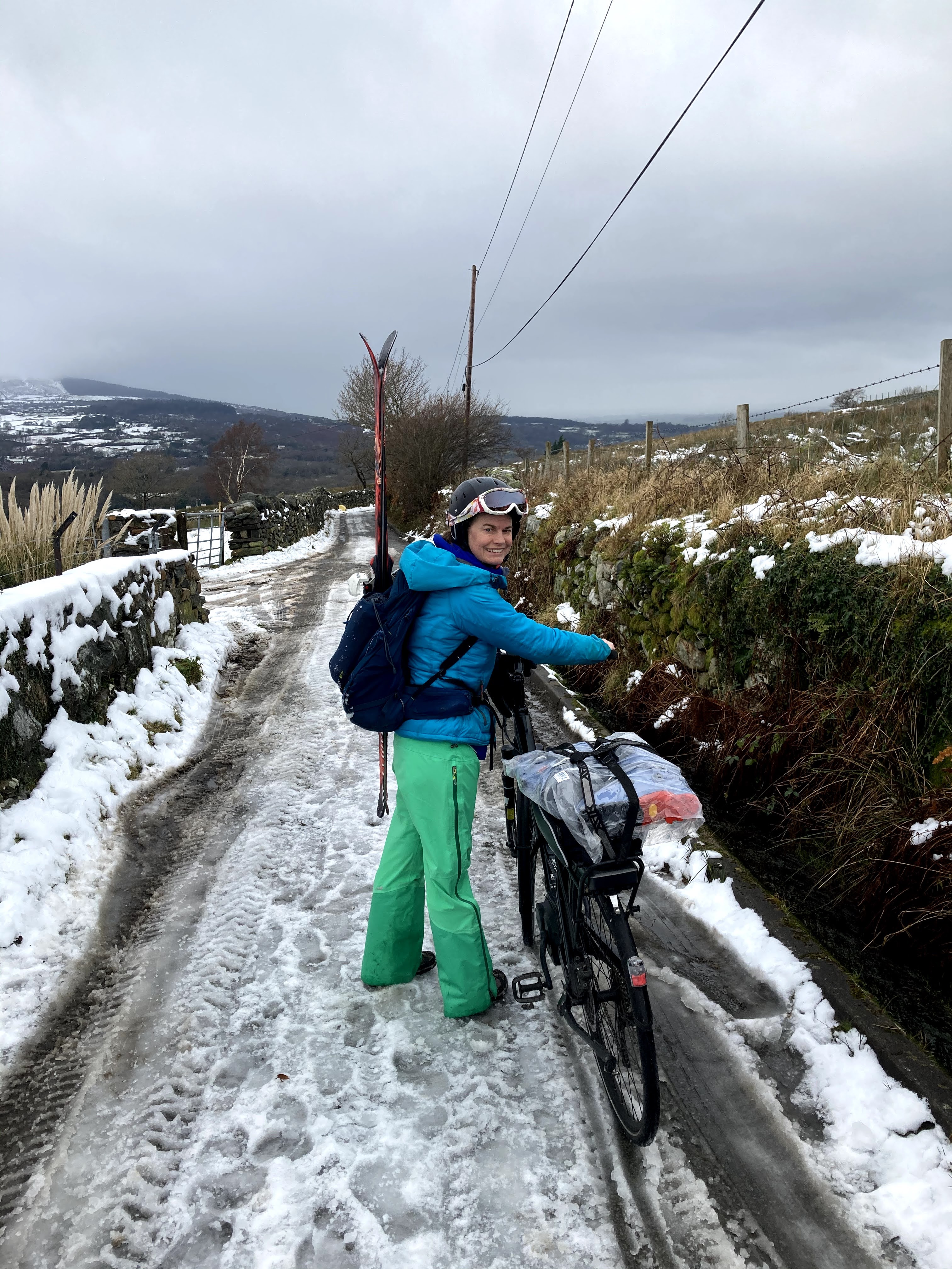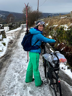 Low clouds were covering all the tops this morning and a band of warm air was approaching off the Atlantic. If we wanted to get the most of the snowy slopes, we were going to have to get out early. No precipitation was forecast until midday, but as we stepped out of the back door, there was certainly ‘moisture in the air’. Undeterred, we set out on our bikes again and this time were able to access the road that was completely iced over yesterday. We went as far as the snowline, (well until we were slightly in the snow and I started falling off the bike!) then locked out bikes to a telegraph pole and continued onwards on skis.