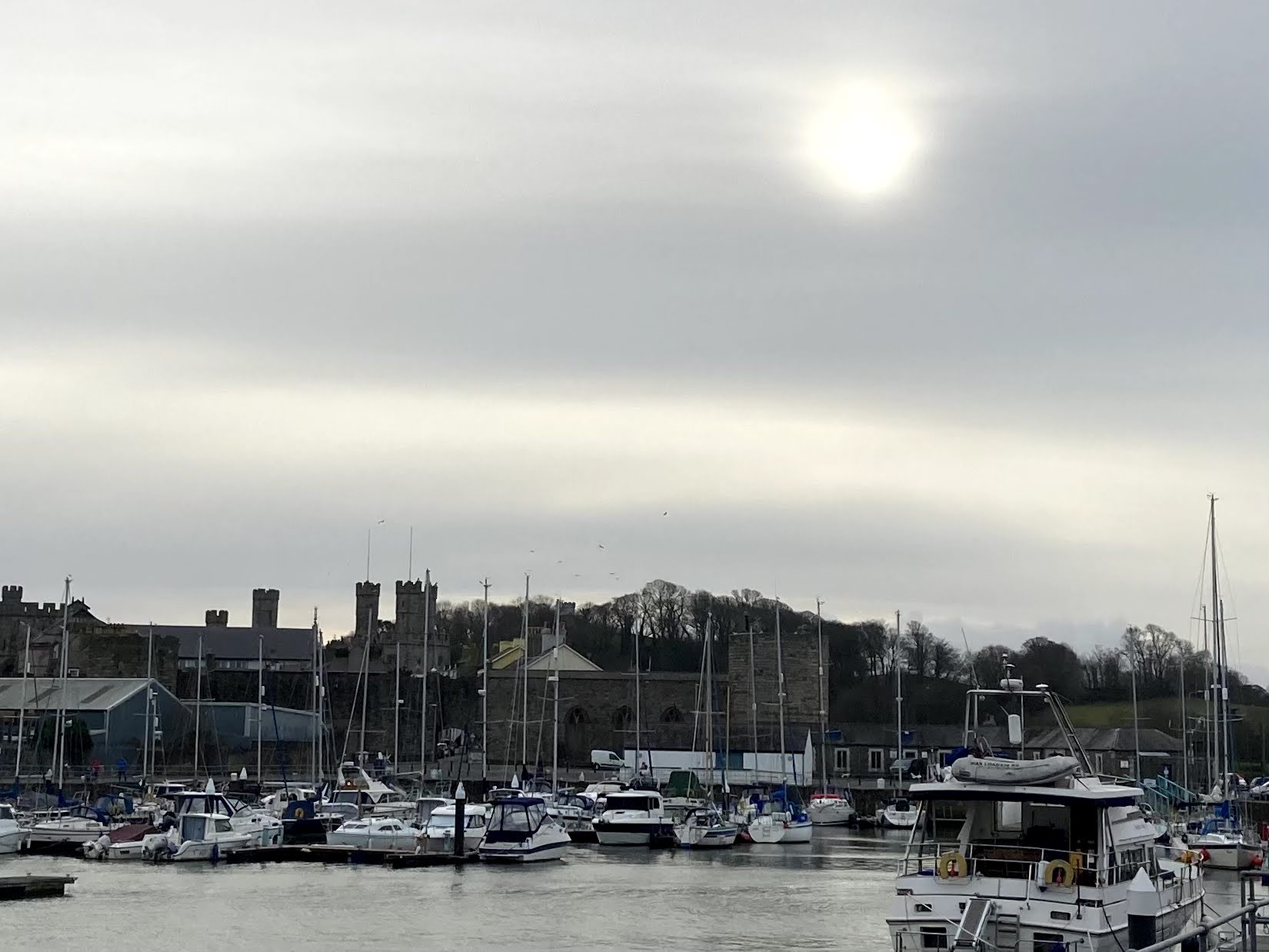 It’s been a ‘low light’ kind of day today. Not good for photographs, but light winds and dry skies meant that a bike ride was on the cards. The coming week looks set to be a particularly wet one, so I was keen to get out and see a different view while we could. Linking up various cycle tracks and back roads, we arrived down in Caernafon, where the tide was full and the sun was doing it’s best to put in an appearance.