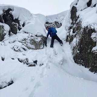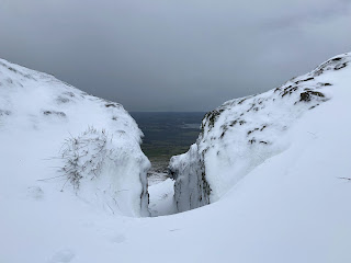 To keep in the lee of the wind, we traversed under the northern slopes of Moel Wnion, where we discovered this little entrance to an old disused quarry. The wind had packed it full of snow inside, turning it into a miniature winter wonderland.