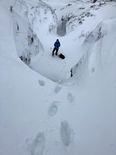 To keep in the lee of the wind, we traversed under the northern slopes of Moel Wnion, where we discovered this little entrance to an old disused quarry. The wind had packed it full of snow inside, turning it into a miniature winter wonderland.