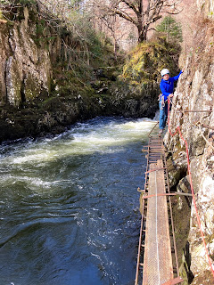 Hidden in the depths of a valley, is a short but impressive gorge, that for reasons unknown to me has, many many years ago, had a short walk-way installed. Not dis-similar in style to the enormous one we’ve been on in El Chorro in Spain. It’s much smaller, but the basic principle of a rickety walk way above a river in a tight gorge is the same!