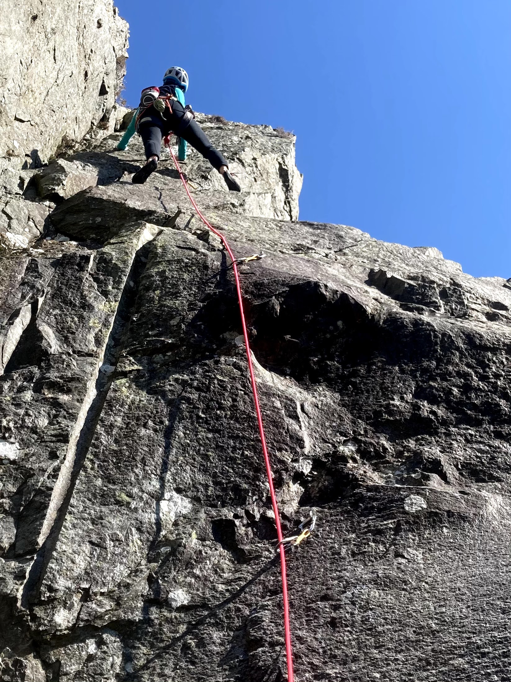 But one area was in the sun and sheltered from the wind, so we sat and warmed up like lizards, enjoying the views. Another couple turned up to climb as well and it was nice to have some friendly crag chat.