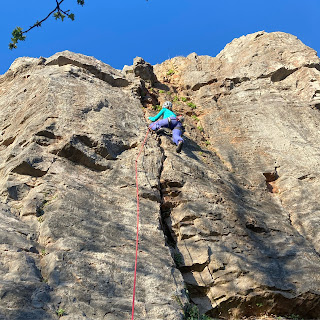 The main cliff is mostly unaffected, but the left had routes (the area above Clare in the first photo), still has some loose material and is probably best avoided if working with less experienced climbers). There was no one else about and the noise of the birds and sheep were all we could here. All rather tranquil really and with a walk in time of less that ten seconds, it served us very well.