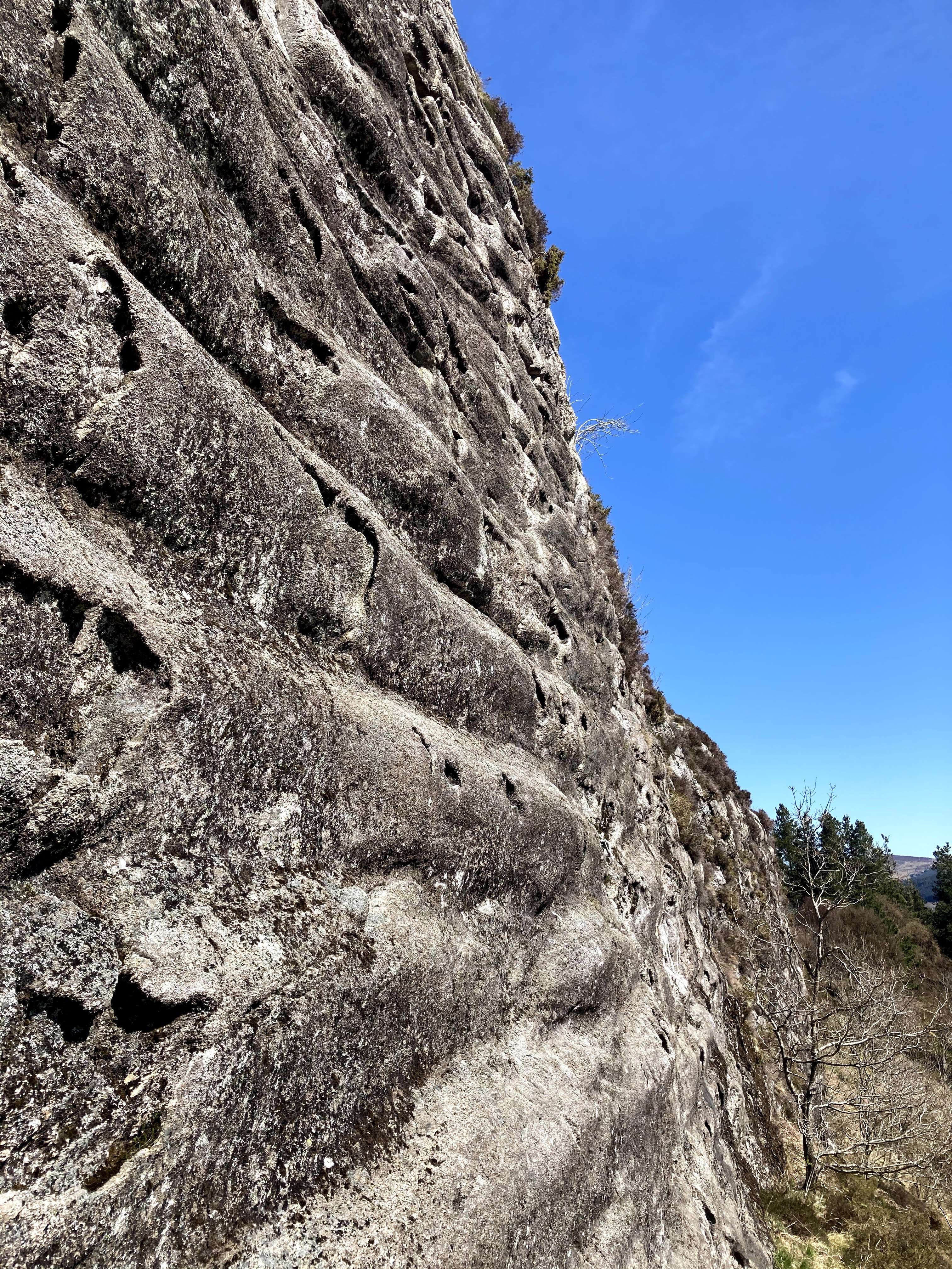 We had gone there to climb at Craig y Tonnau, which has a unique ‘rippled’ look to it. It was a sheltered sun trap and although a small mission was had finding it thanks to an outdated guidebook description, we had a great time there. (For future reference, stay on the forest track, past a small rock cutting on the left then take the next left hand path about 100m later – avoid the fire break and pylon route!)