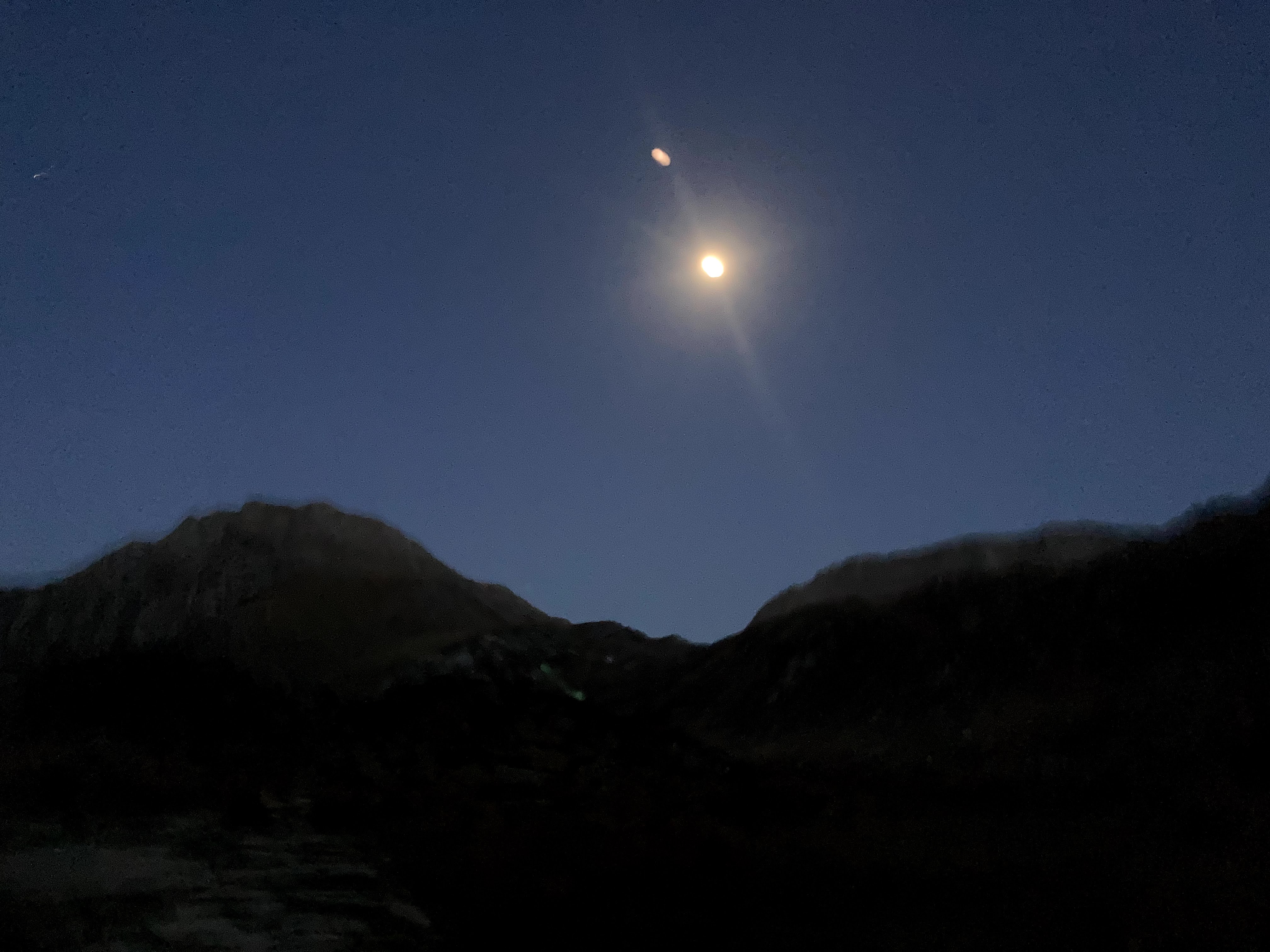 There was a beautiful sunset, which we enjoyed from the ledges while paying out the ropes. There is still a strong cold wind, but we were pretty much sheltered on our route. There was no time for snacking when we reached the top of the climbing. Instead we carried on to the descent, arriving back at our bags as the moon began to rise.