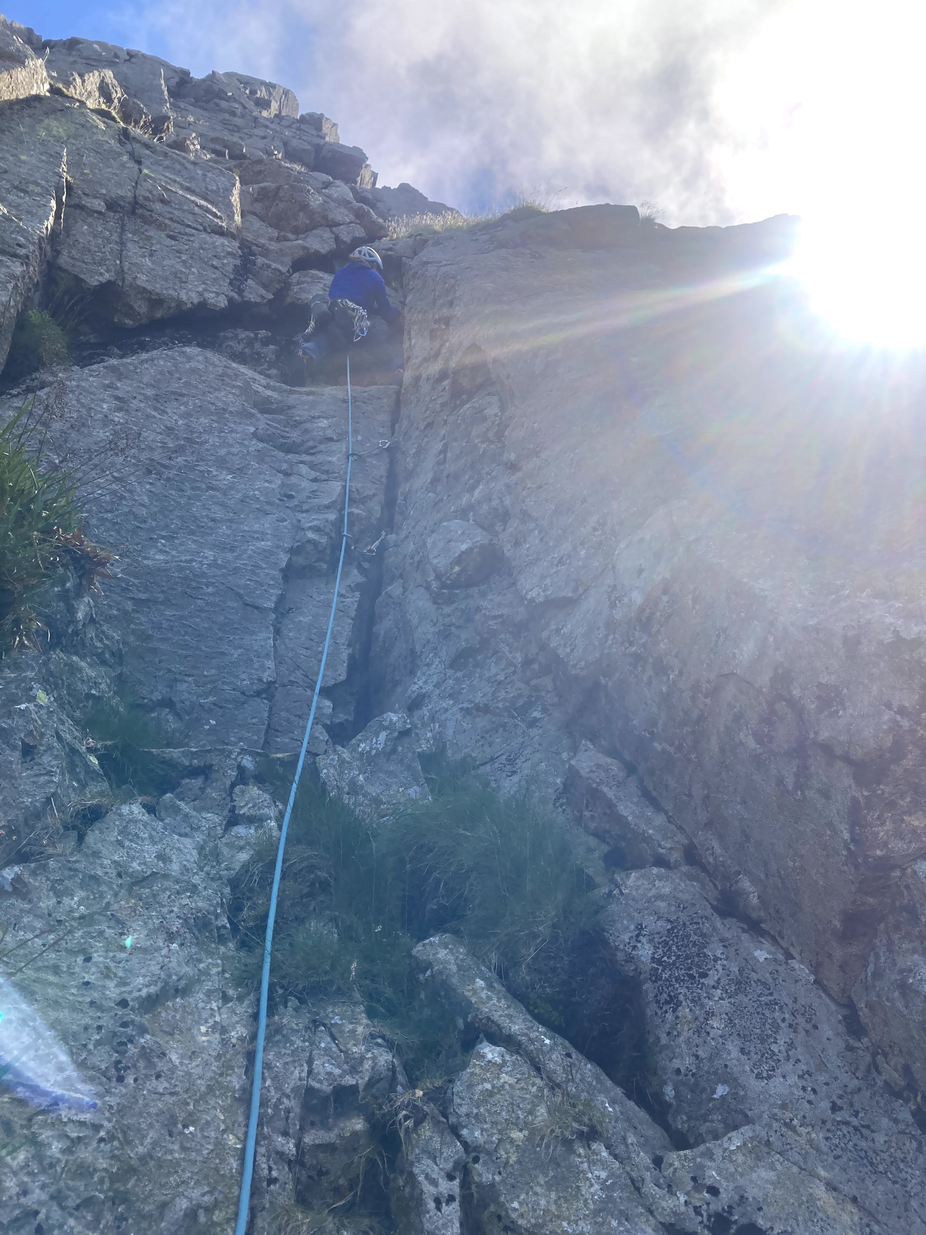 At the base of the cliffs, the temperature was much cooler as the sun had not quite come around. Clare set off first, linking the first two pitches. From then on we swung leads up various brilliant pitches of climbing as the sun burst around the arete.