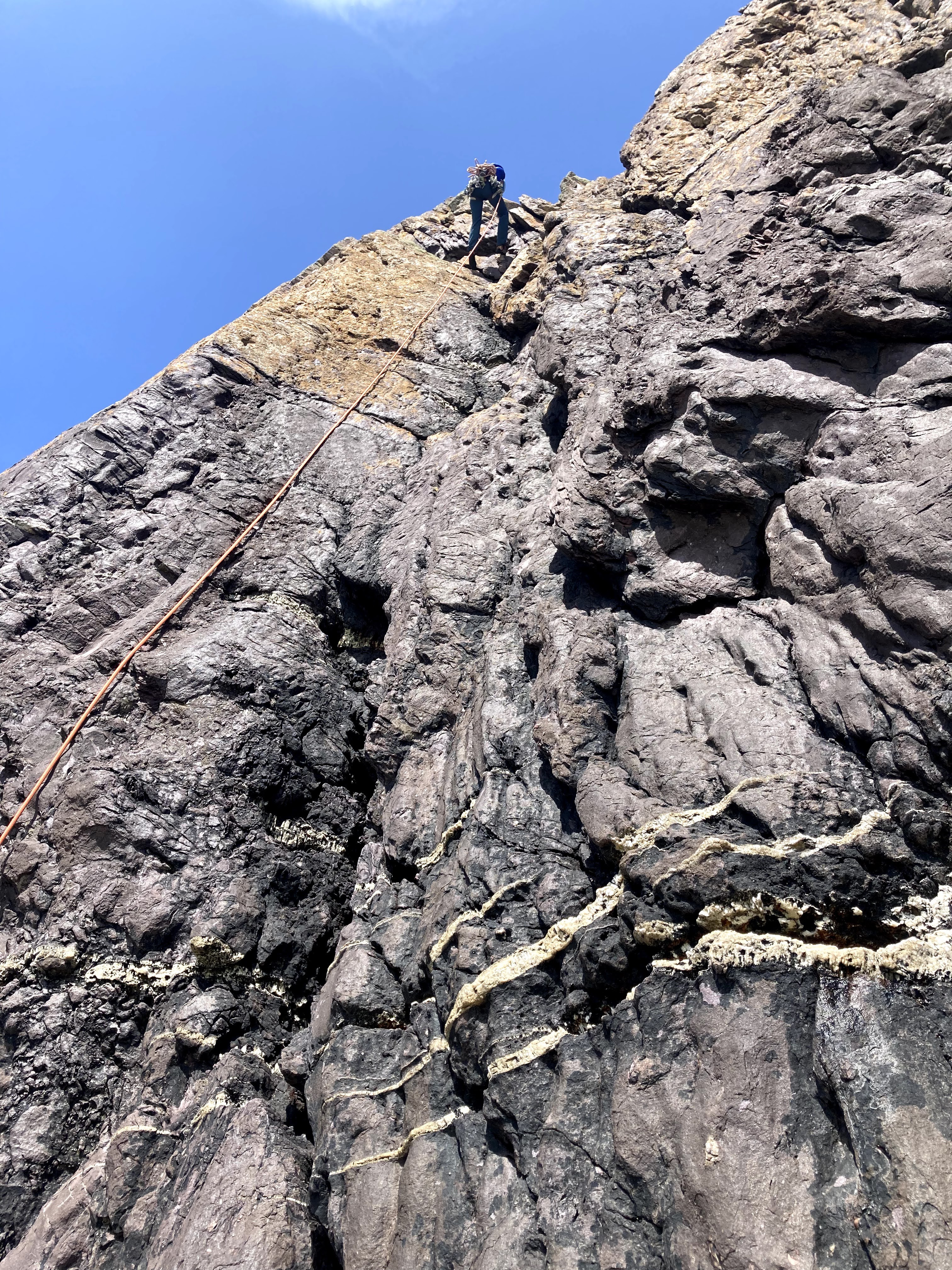 A pair of other climbers (from Cambridge) also turned up and very nicely let us use their abseil rope which we used to access some of the other climbs further along the cliff as the tide receded. In between climbs, we swapped tales of travels and watched the gannets dive bombing into the sea.